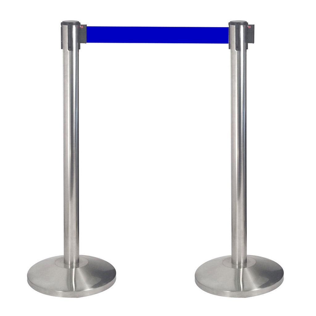 Edelstahl-Spannsäulen mit gebürsteter Oberfläche, ausgestattet mit selbstbremsendem Spannsystem und 3 Aufnahmehaken. 65 mm Betonsockel mit oberer Abdeckung aus gebürstetem Stahl und rutschfester unterer Dichtung.