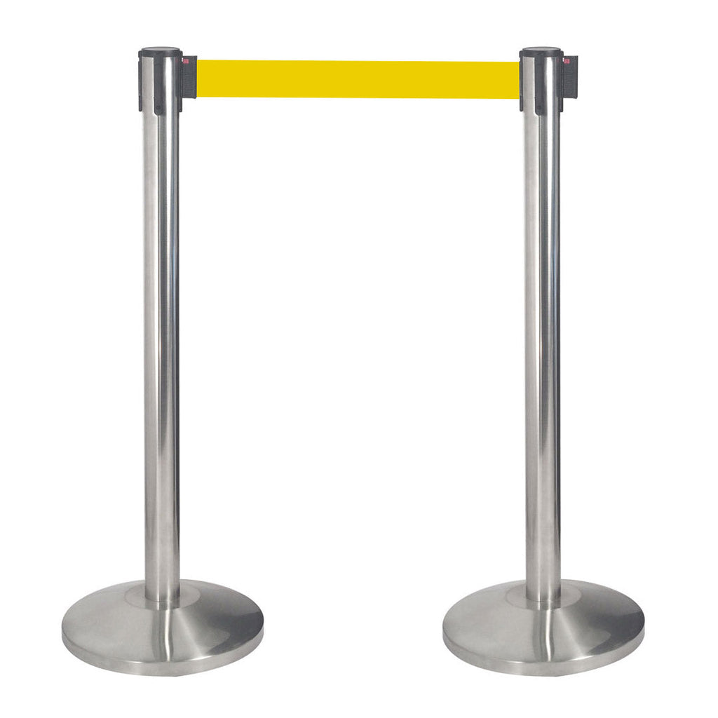 Edelstahl-Spannsäulen mit gebürsteter Oberfläche, ausgestattet mit selbstbremsendem Spannsystem und 3 Aufnahmehaken. 65 mm Betonsockel mit oberer Abdeckung aus gebürstetem Stahl und rutschfester unterer Dichtung.