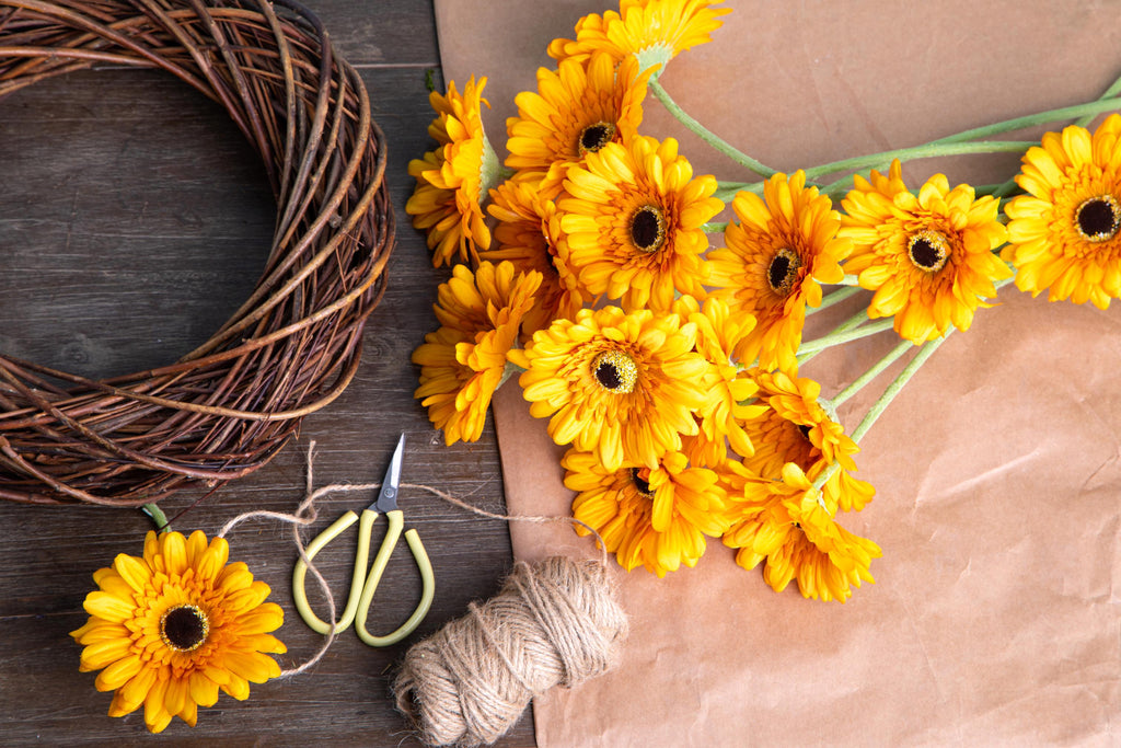 Set mit 12 künstlichen Gerbera-Blumen, Höhe 63 cm, gelb