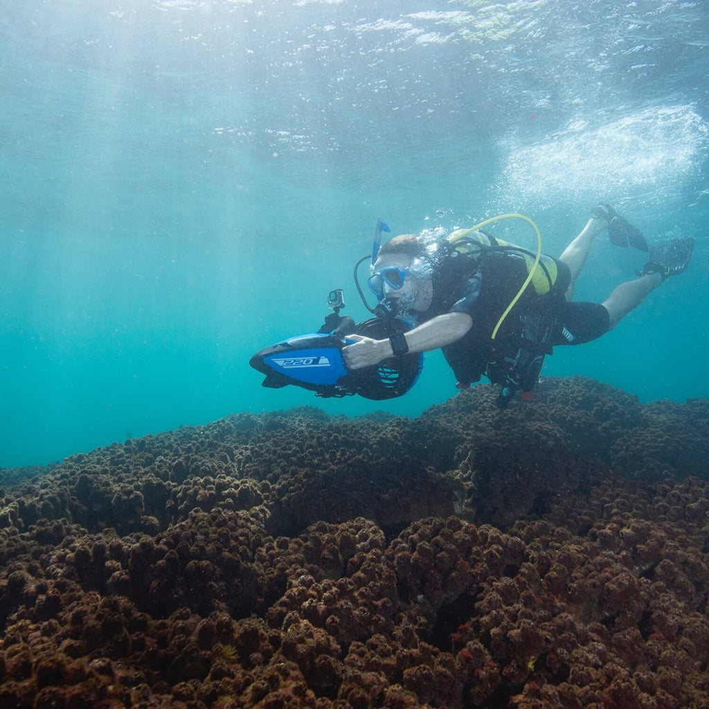 Elektrisches Taucherantriebsfahrzeug (DPV) mit 220 W Leistung und Li-Ionen-Akku mit einer Laufzeit von bis zu 60 Minuten.