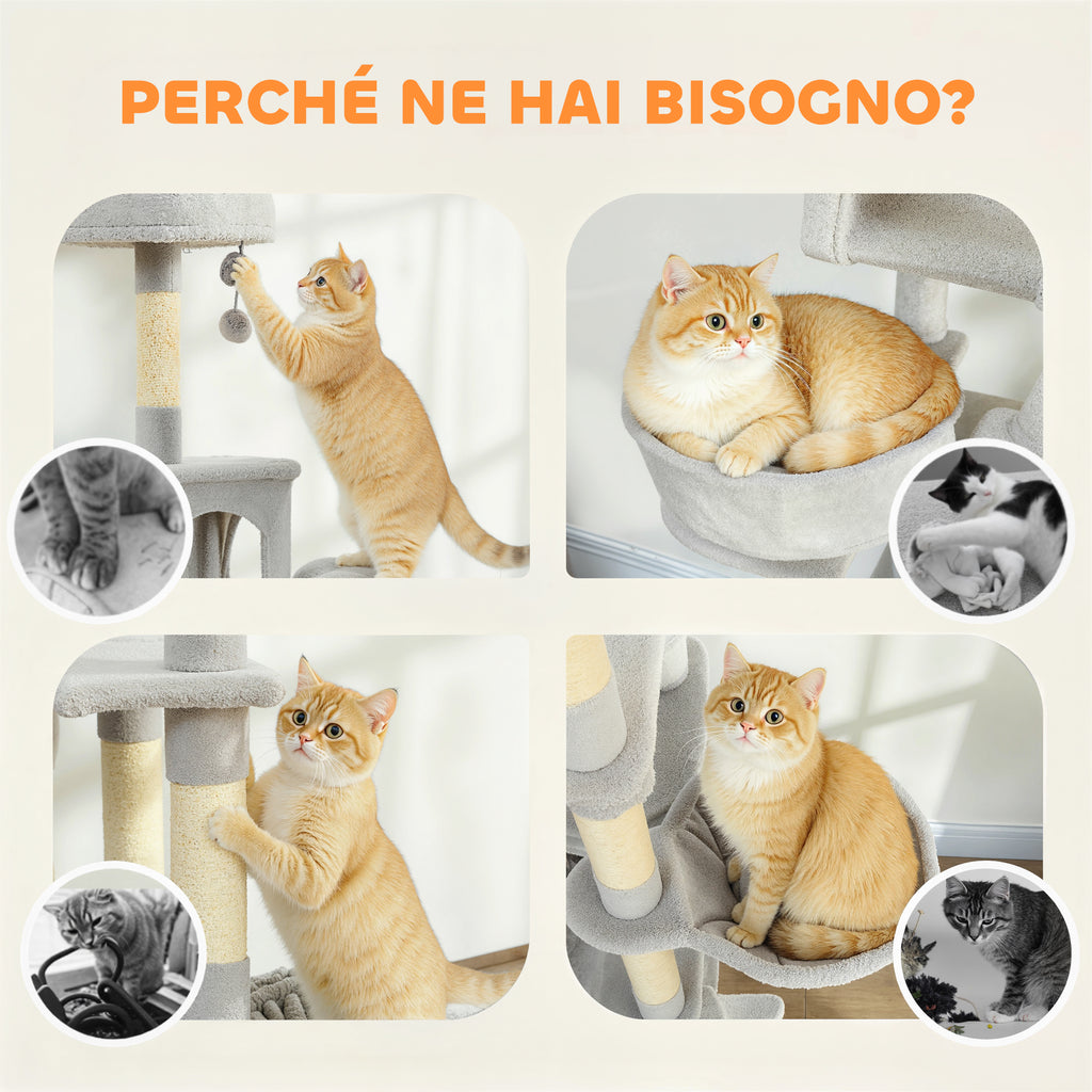 - COMFORT ASSICURATO: Grazie ai 3 letti morbidi, 2 grotte, 3 piattaforme di salto, una scala tiragraffi e 2 amache, la nostra torre per gatti offre vari angoli accoglienti per un relax condiviso ed estremamente godibile