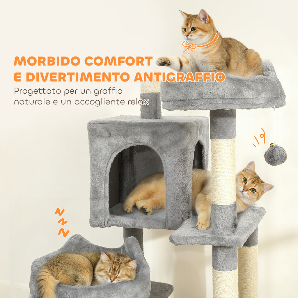 Questo albero tiragraffi per gatti di 192 cm multilivello rappresenta un parco giochi verticale per salti, arrampicate e relax. Sono presenti 3 trespoli, 2 ampie grotte e 2 amache per ospitare più gatti contemporaneamente nello stesso spazio. I pali in sisal naturale e la rampa tiragraffi proteggono i mobili e garantiscono divertimento continuo, mentre la struttura in truciolato robusto con copertura in peluche garantisce il giusto livello di comfort e sicurezza.