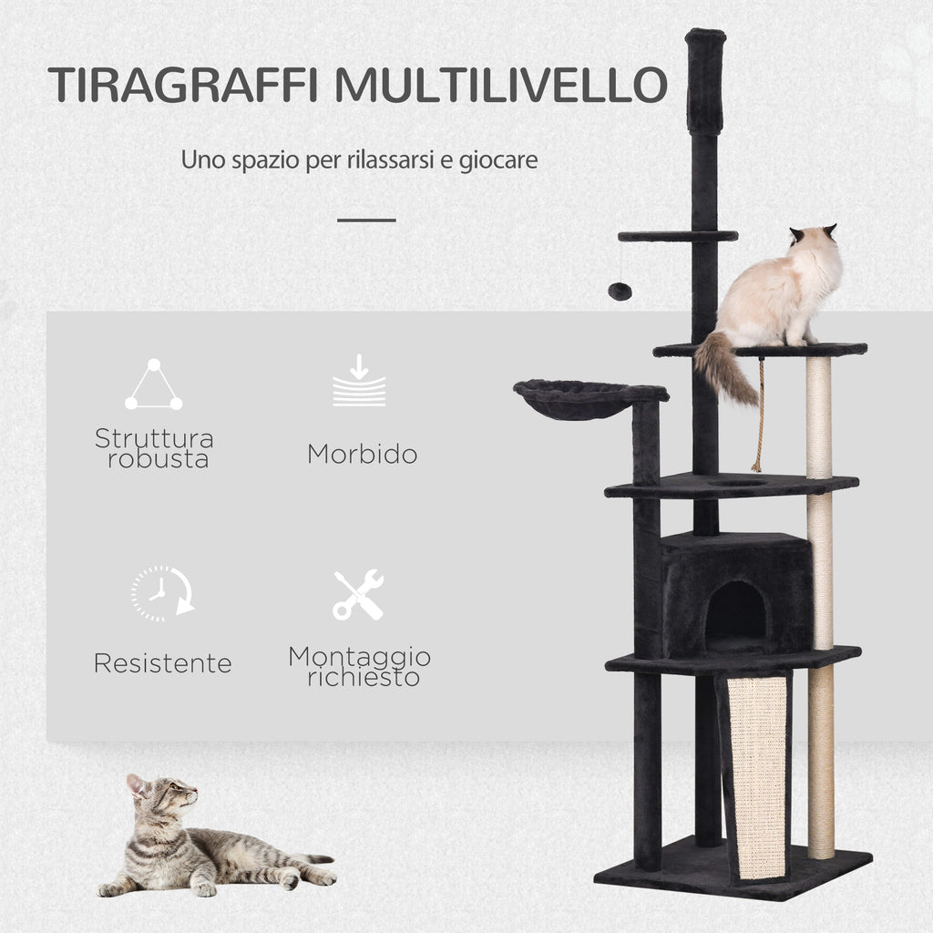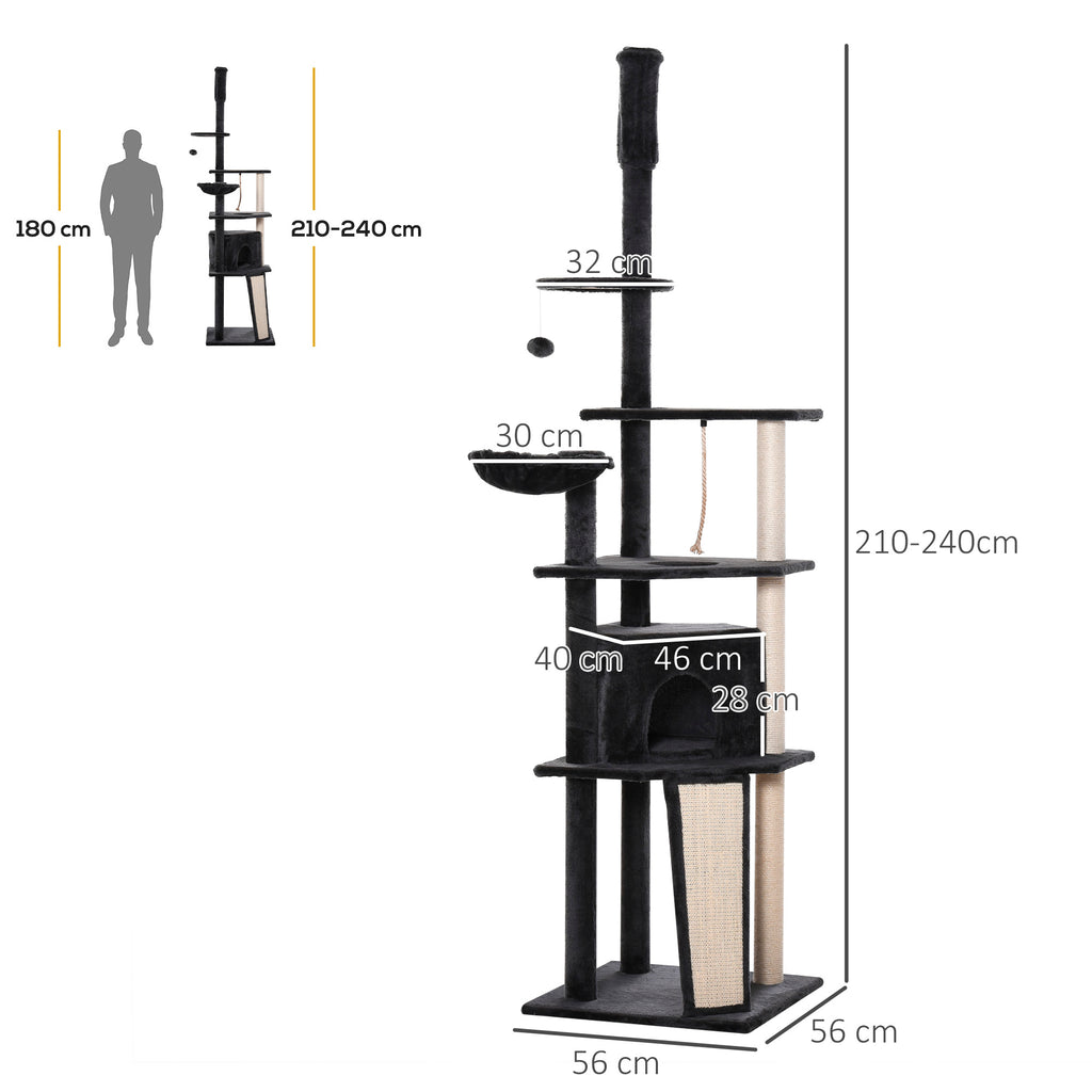- ALL-IN-ONE: Dieser Kratzbaum hat eine Höhe von 210 bis 240 cm und kann zur Stabilität an der Decke befestigt werden. Es verfügt über Plattformen, ein Haus, eine Hängematte, einen hängenden Ball und ein Seil, um Platz für Ihre Katzen zu schaffen, damit sie Spaß haben und sich ausruhen können.