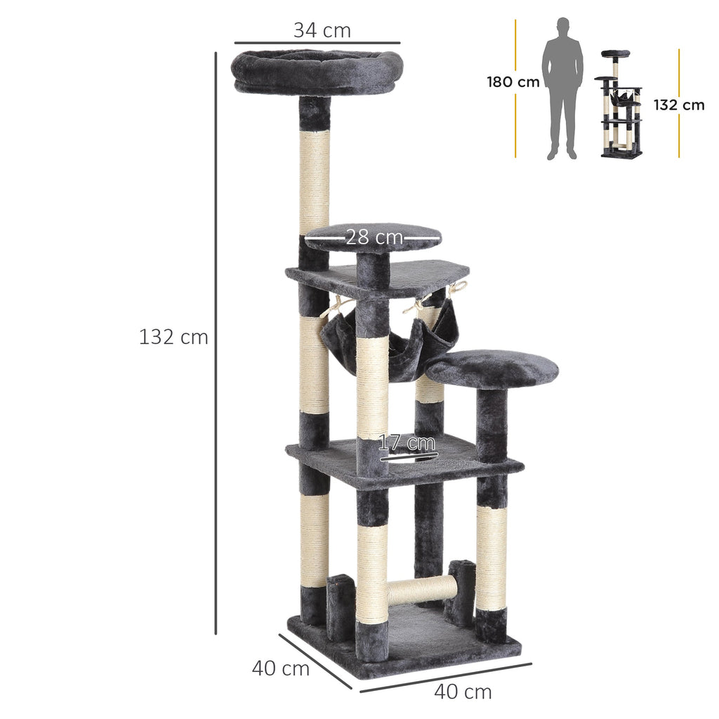 Kratzbaum für Katzen mit 4 Ebenen aus grauem Natur-Sisalplüsch 40x40x132 cm