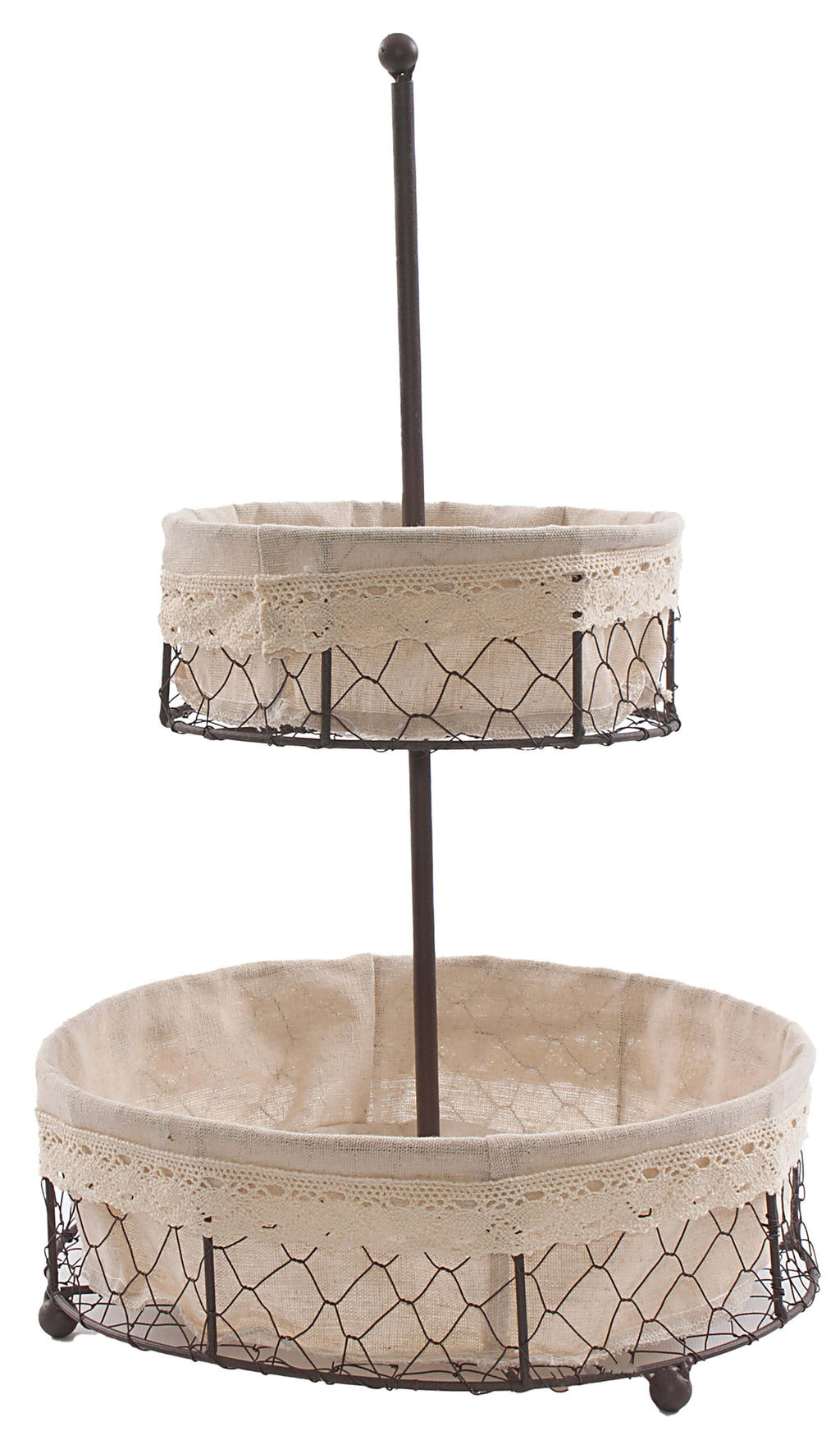 Alzata a due piani. La struttura è in metallo realizzato a rete, fodera in cotone color ecrù. Adatto come centrotavola, ricrea un'atmosfera romantica e provenzale. La fodera è lavabile.