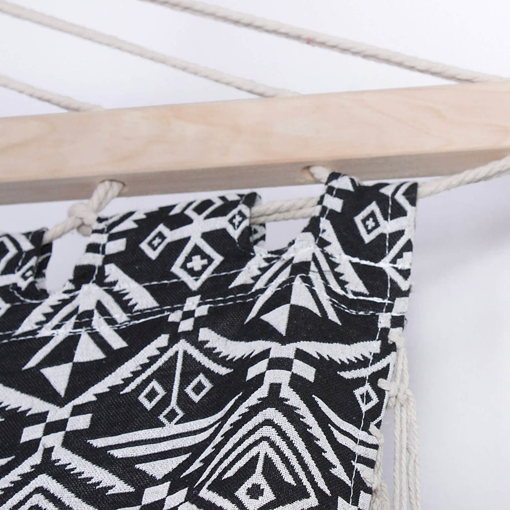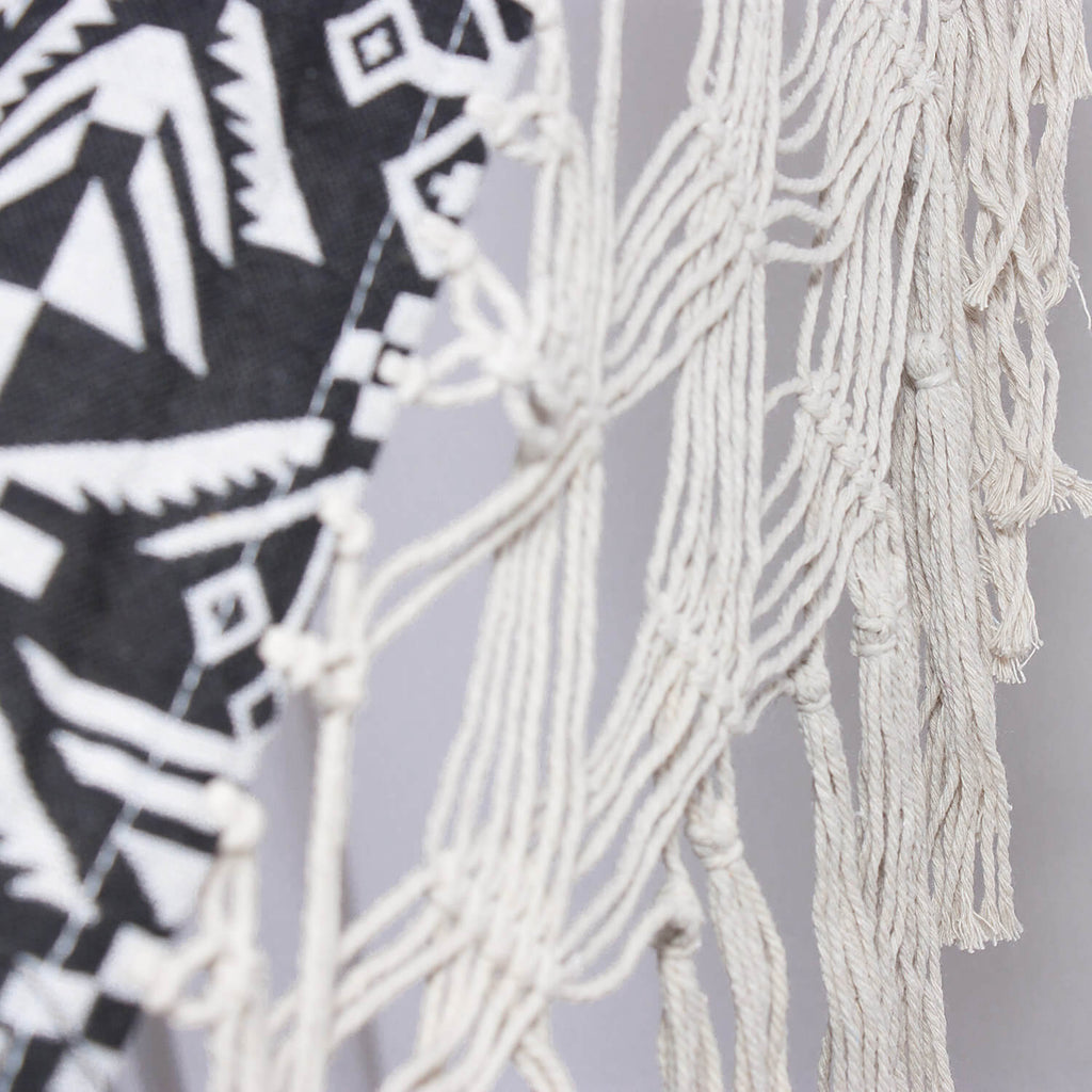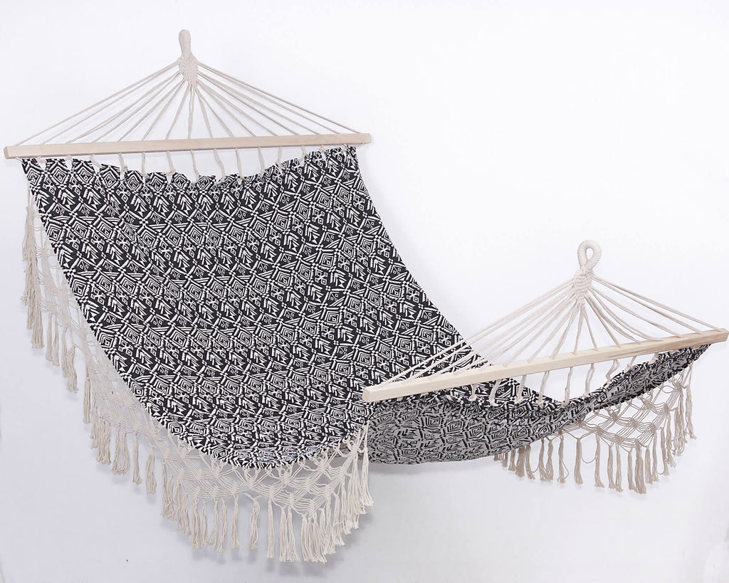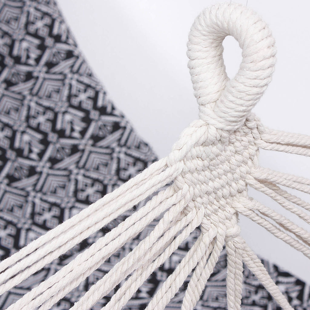 Amaca in policotone con disegni geometrici in colore bianco e nero, con frangia in macramé. Tessuto soffice e sottile come il cotone e resistente, antistrappo e durevole come il poliestere. Larga e comoda, ideale per il giardino, il campeggio o la spiaggia.