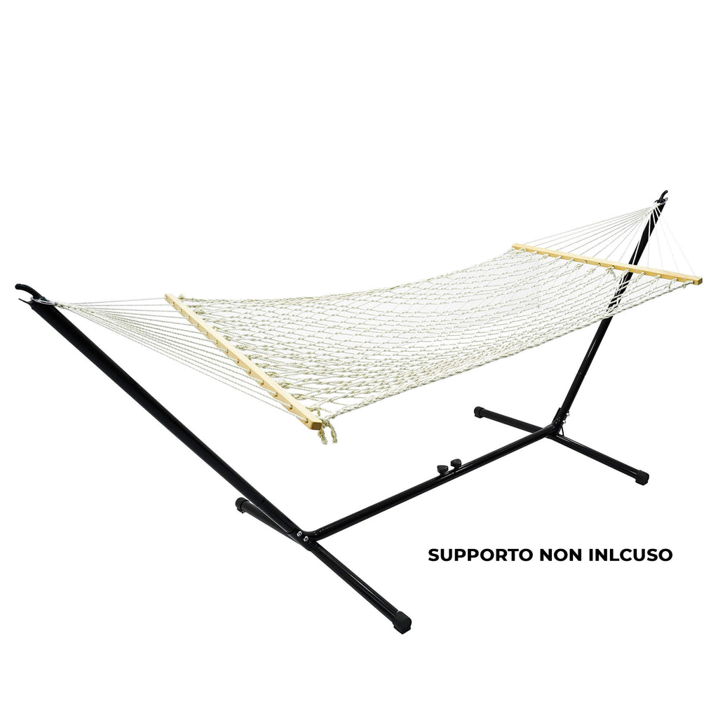 Hängematte aus Baumwolle für mehr Komfort und Weichheit, perfekt zum Entspannen im Freien in absoluter Sicherheit, da sie ein Gewicht von bis zu 150 kg tragen kann. Die Montage ist denkbar einfach, tatsächlich dauert es nur wenige Minuten, bis Sie Ihre wohlverdiente Entspannung genießen können.