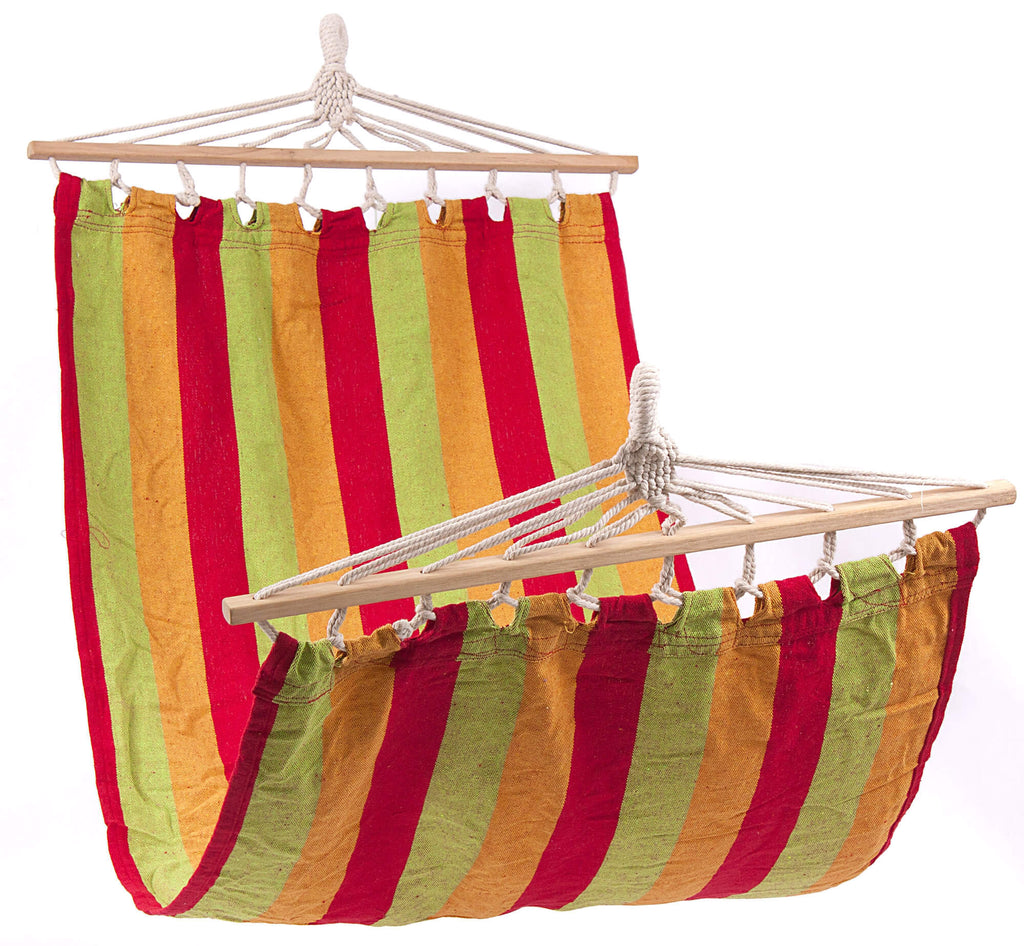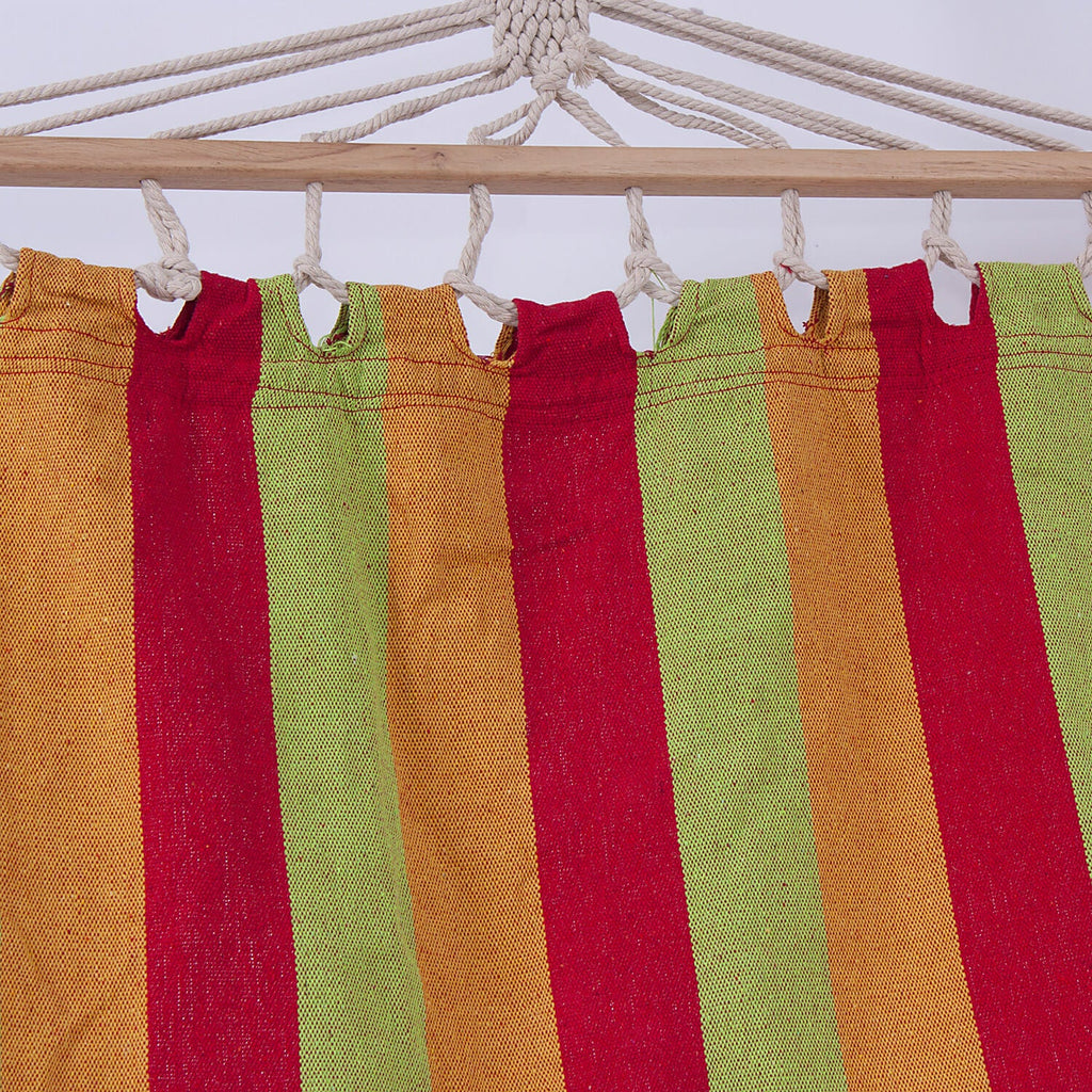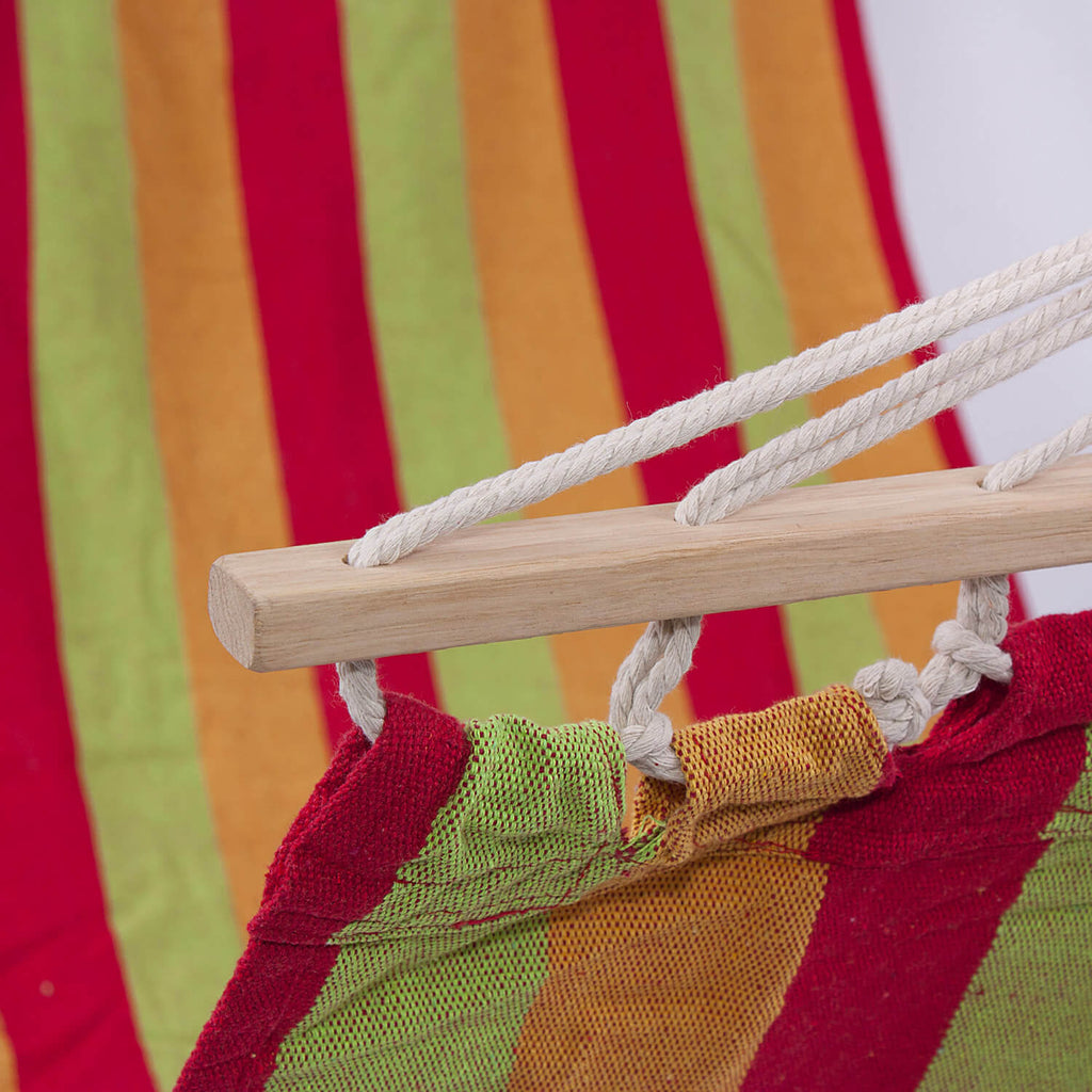 Amaca in policotone a righe arancione, rosso, verde. Tessuto soffice e sottile come il cotone e resistente, antistrappo e durevole come il poliestere. Ideale per il giardino, il campeggio o la spiaggia.