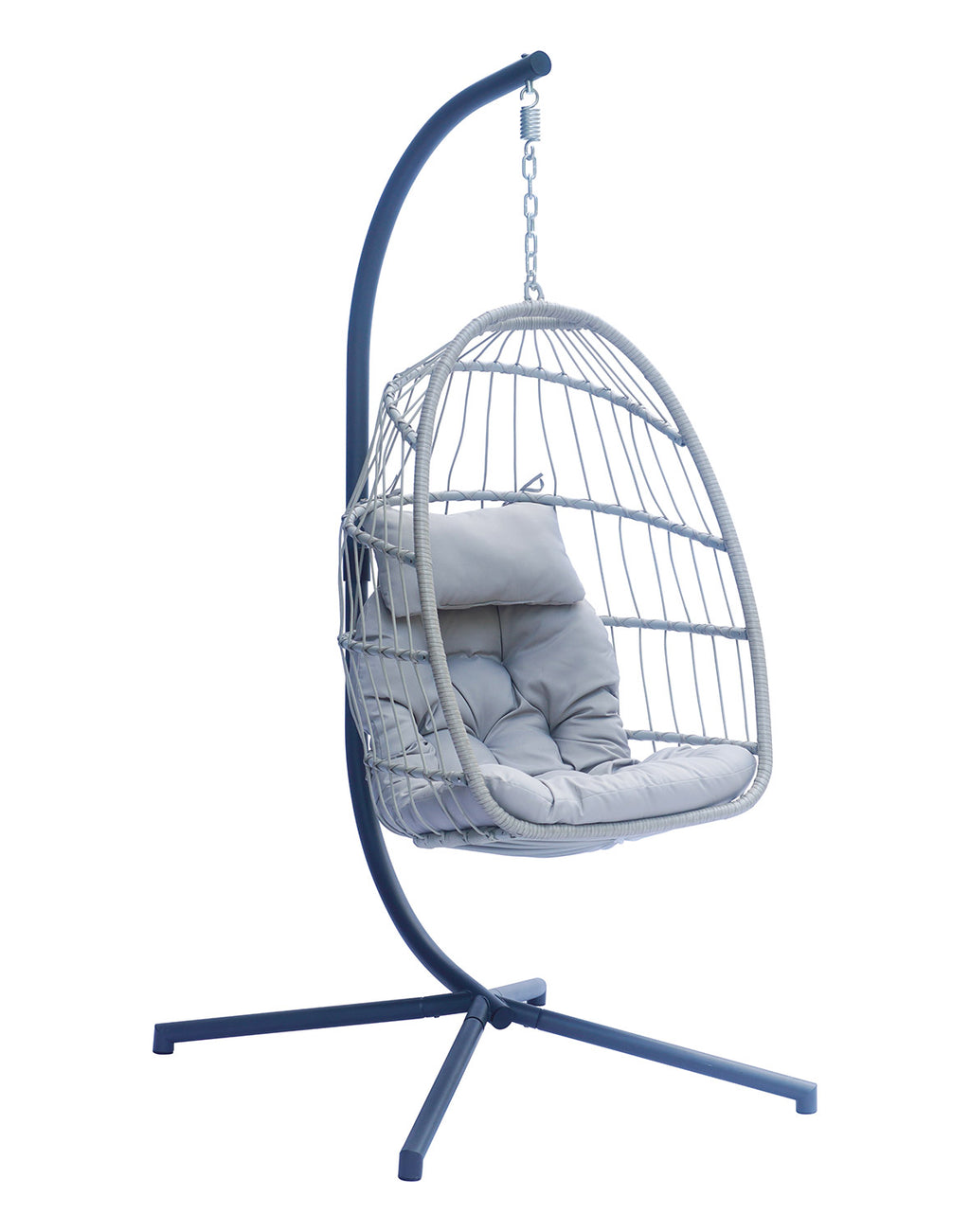 La poltrona sospesa è caratterizzata da un supporto in alluminio antracite e da una corda grigia chiara resistente di 5 mm. Il wicker grigio chiaro conferisce un tocco di eleganza e modernità all'arredo. Il cuscino in poliestere grigio chiaro assicura comfort e stile, mentre le dimensioni complessive di 96x198x115 cm e un'altezza totale di 196 cm la rendono perfetta per momenti di relax all'aperto.
