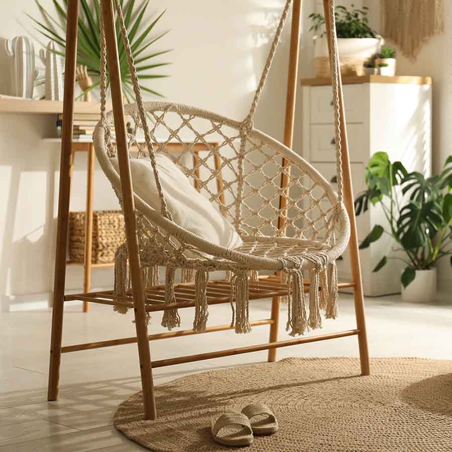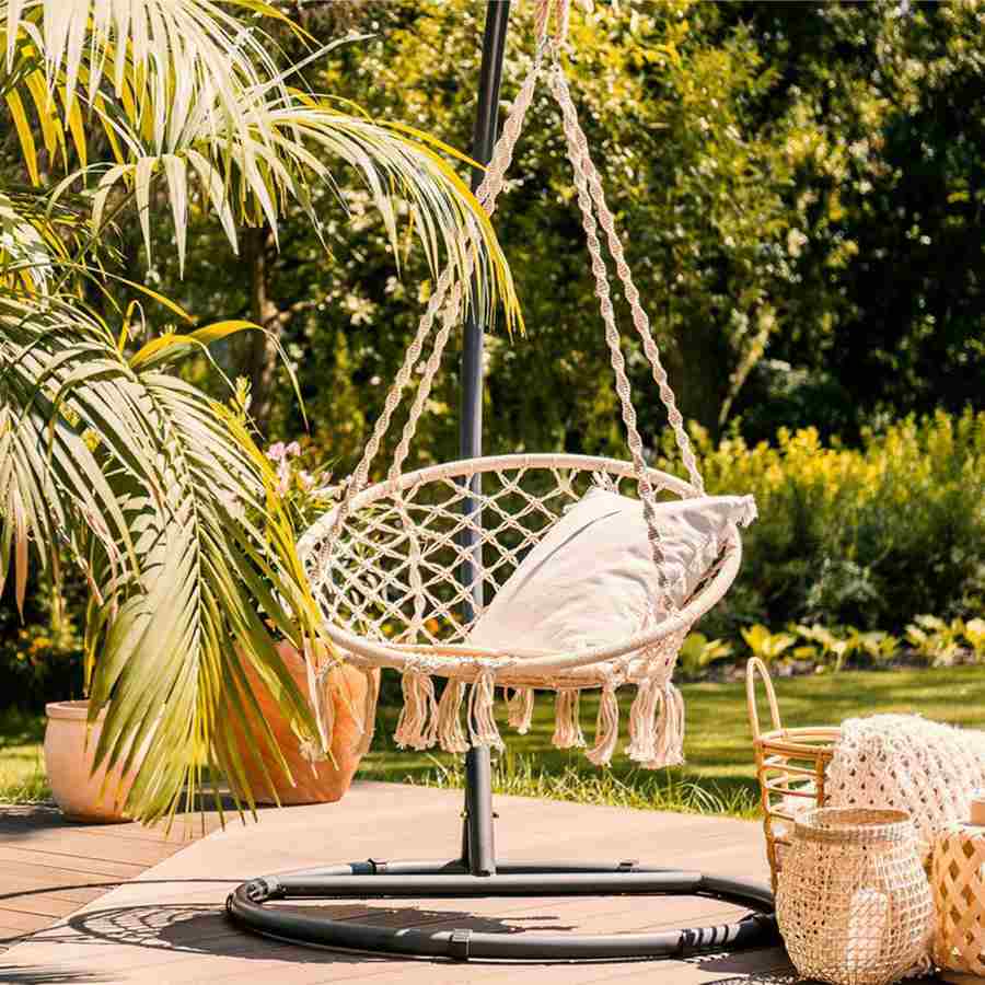 Dai un tocco originale al tuo outdoor con la nuova amaca sedia a dondolo tonda Jane! Realizzata in resistente policotone e con struttura in acciaio, l'amaca da giardino Jane è perfetta per completare il tuo arredo giardino con stile ed eleganza, senza rinunciare al relax e alla comodità.