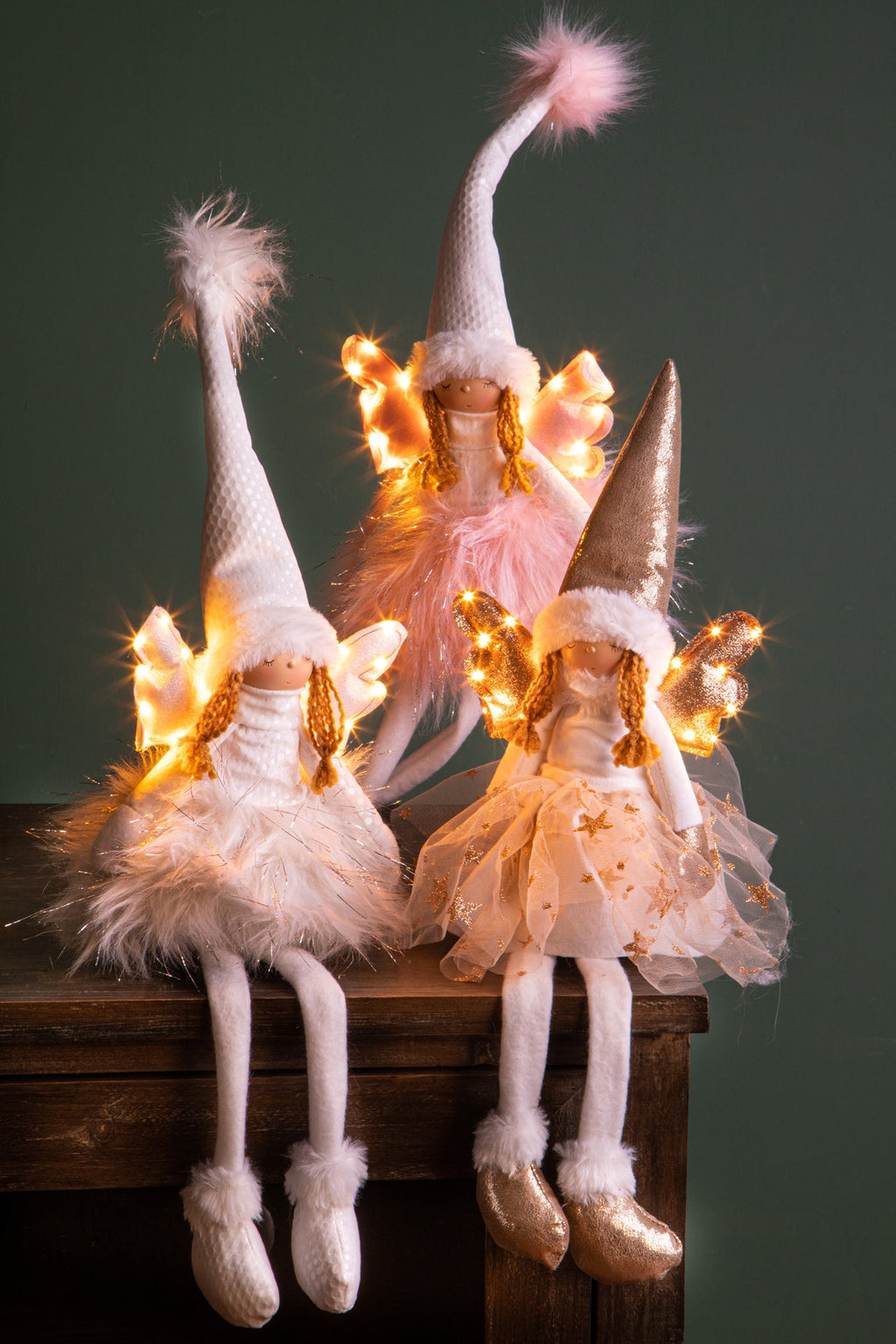 Sitzender Engel mit Led H60 cm in Champagnerfarbenem Stoff