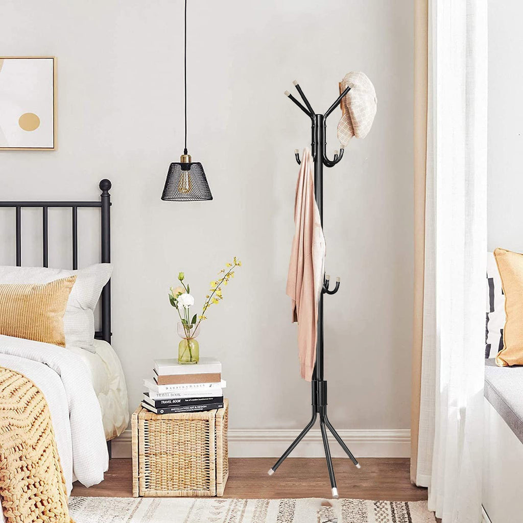Dank der 11 Haken auf verschiedenen Ebenen können Sie Jacken, Taschen, Schals oder kleine Regenschirme ordentlich und organisiert aufhängen. Seine Metallstruktur macht es stabil, aber gleichzeitig sehr leicht, Sie können es mühelos in verschiedenen Teilen des Hauses platzieren. Seine schwarze Farbe hingegen macht es einfach, ihn mit allen Arten von Möbeln zu kombinieren.