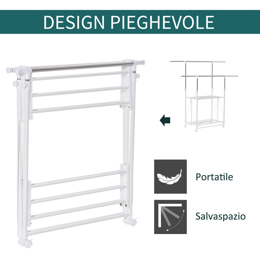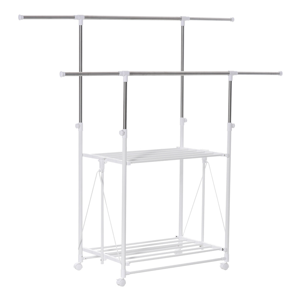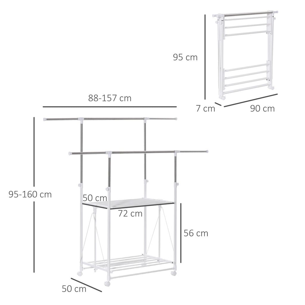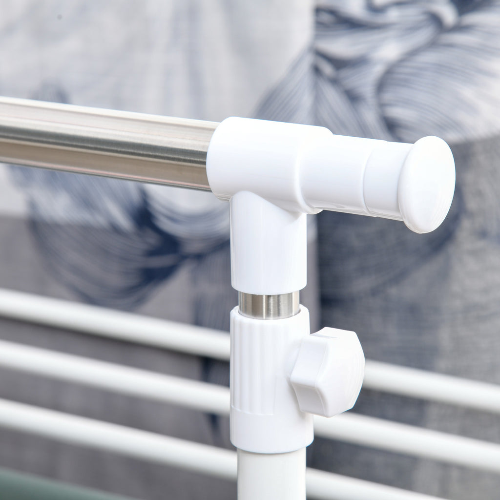 Ausziehbarer Garderobenständer mit 2 fahrbaren Ablagen und höhenverstellbarer Stahlkonstruktion 88-157x50x95-160 cm Weiß
