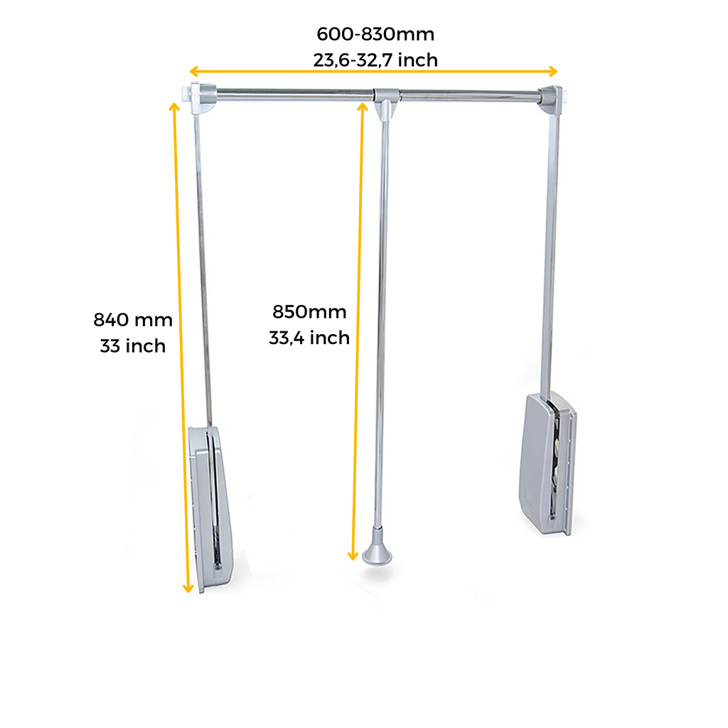 L'appendiabiti per armadio Hang permette di avere accesso alla zone più alte dell'armadio senza sforzo. La barra è regolabile in larghezza per essere adattata al vano utile dell'armadio, oltre ad avere un movimento dolce con ritorno ammortizzato ha una capacità di carico massimo di 12 kg. In caso di installazione sull'armadio con porte a battente si raccomanda il montaggio insieme agli spessori laterali Hang 7085025/7085013/7085017/7085049.