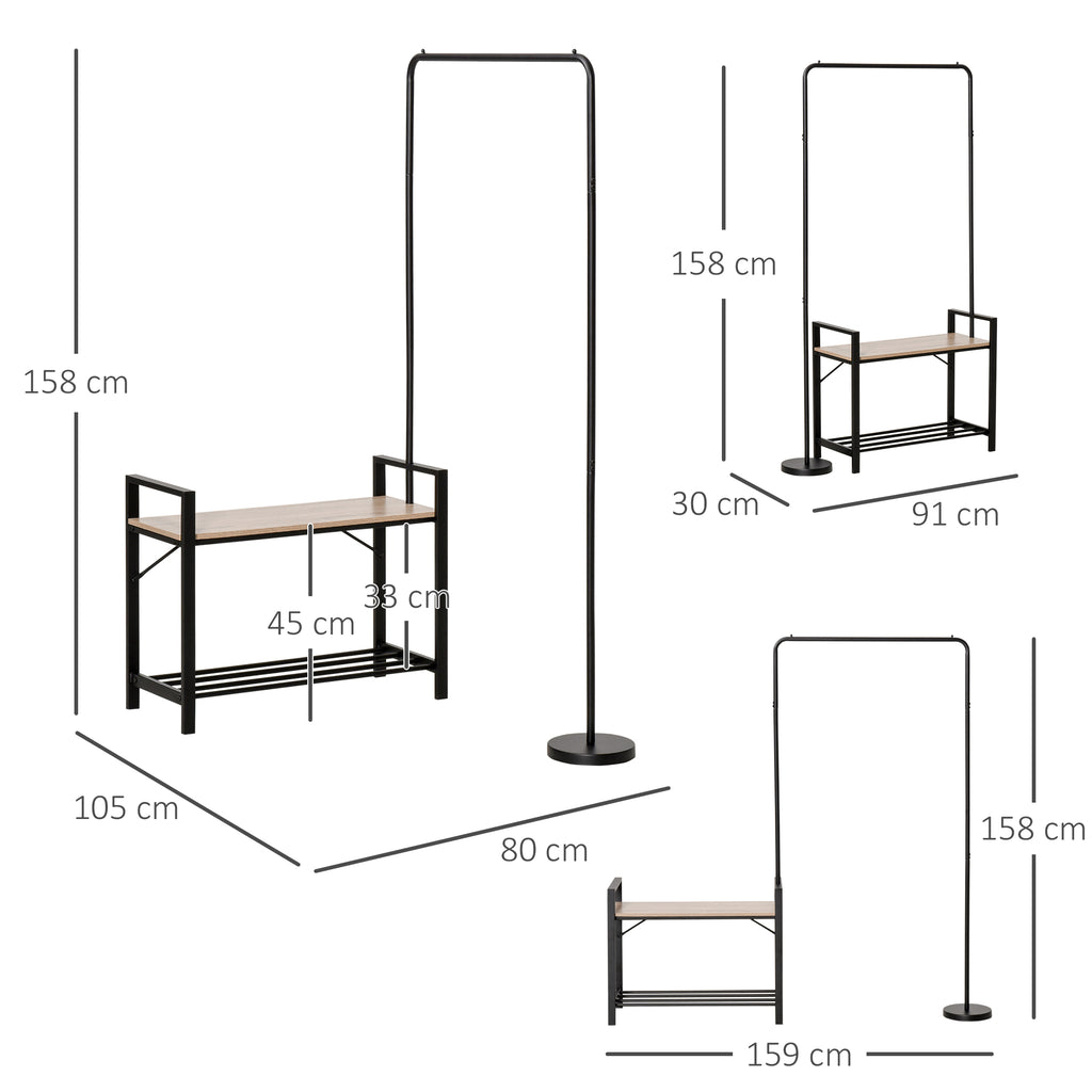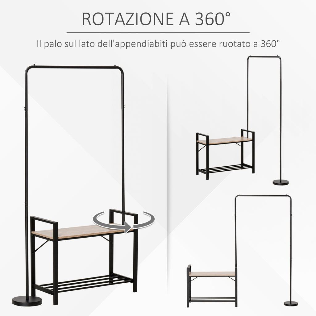 Sorgen Sie mit der Bodengarderobe für Ordnung. Es hat eine Garderobe und eine Schuhablage, um Ihre Taschen, Mäntel und Schuhe aufzubewahren. Mit einer Sitzbank eine bequeme Sitzgelegenheit zum Schuhe wechseln. Um 360 ° drehbares Design, Sie können die Formen nach Ihren Bedürfnissen ändern. Der elegante Stil macht diese Garderobe perfekt, um sie mit jeder Art von Möbeln und in jedem Raum zu integrieren.