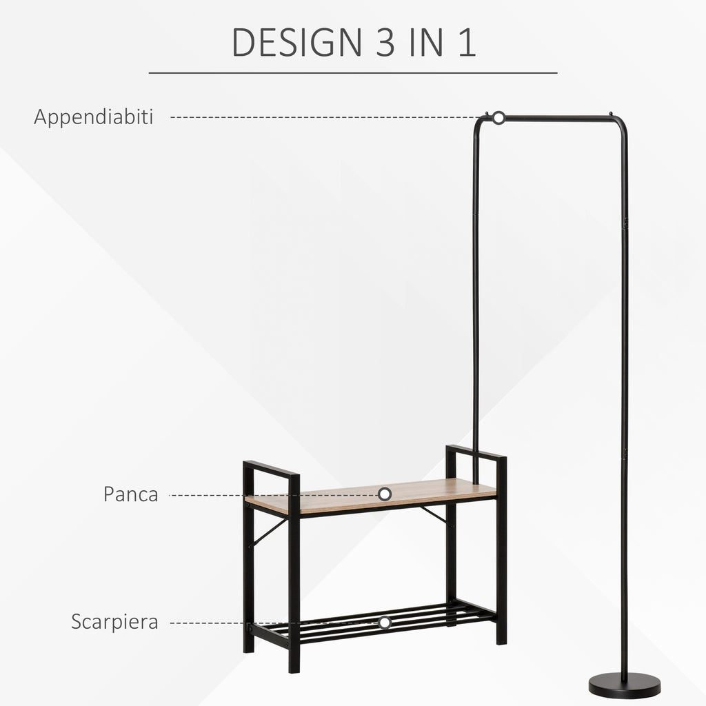 Bankgarderobe für den Eingang 91 x 30 x 158 cm mit Schuhregal aus Holz und schwarzem Metall