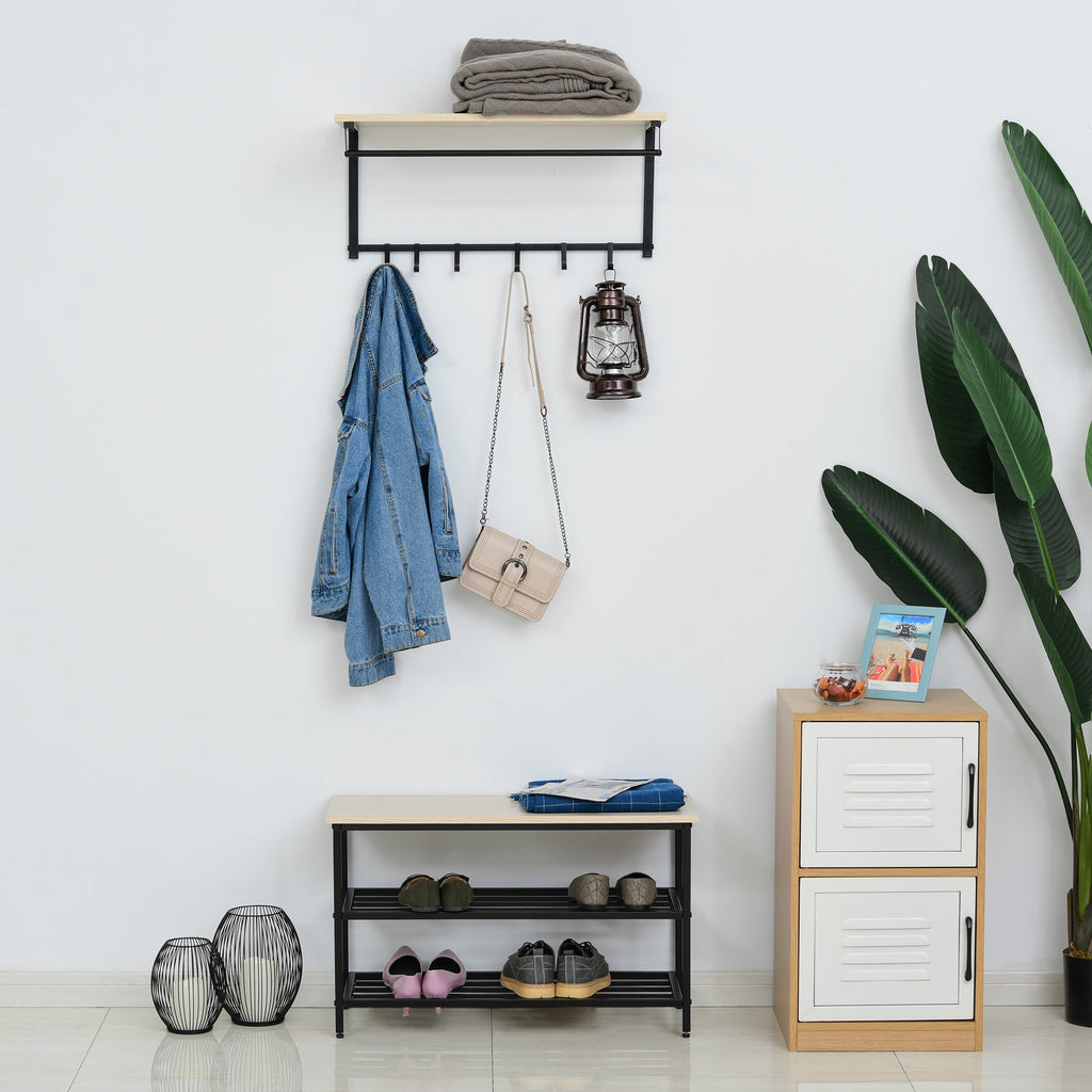 Bank Kleiderbügel mit Schuhregal aus Holz und schwarzem Metall