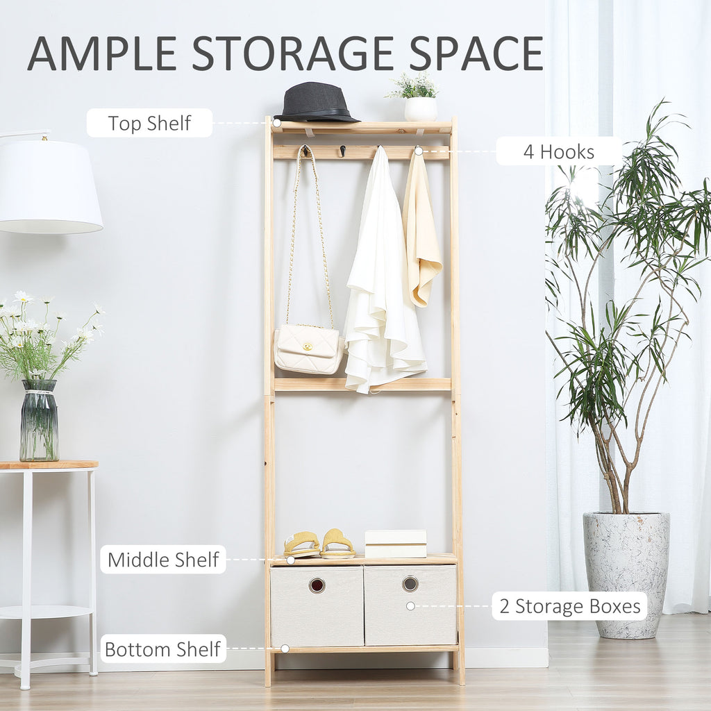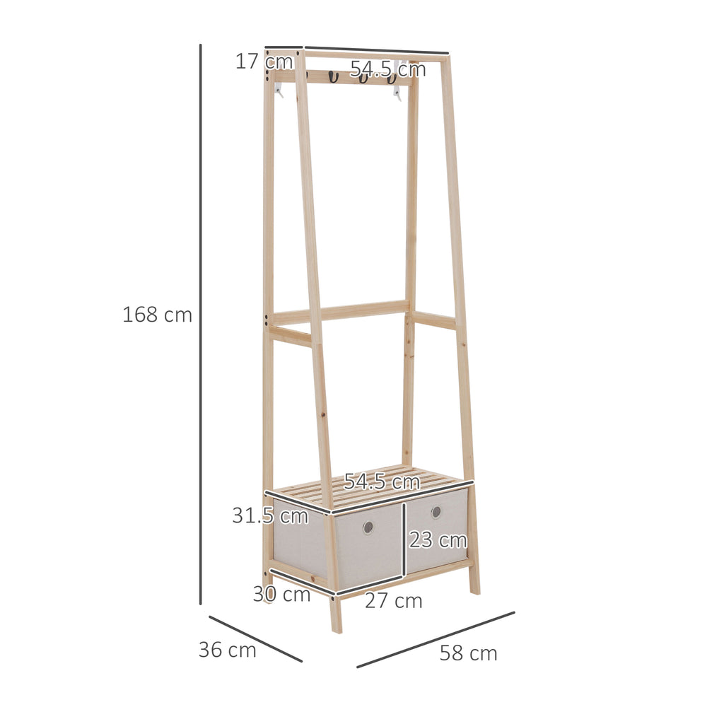 Halten Sie Ihre Mäntel, Kleider und Taschen mit der Garderobe organisiert. Es verfügt über 4 Haken und 3 Ablagen sowie 2 praktische Stoffschubladen, in denen Sie alles ordentlich verstauen können. Die Garderobe ist mit einem Kippschutz ausgestattet, der für optimale Stabilität sorgt. Der rustikale Stil mit unlackierter Naturholzstruktur verleiht jedem Raum eine originelle Note. Wählen Sie es für den Eingang, das Schlafzimmer oder das Wohnzimmer!