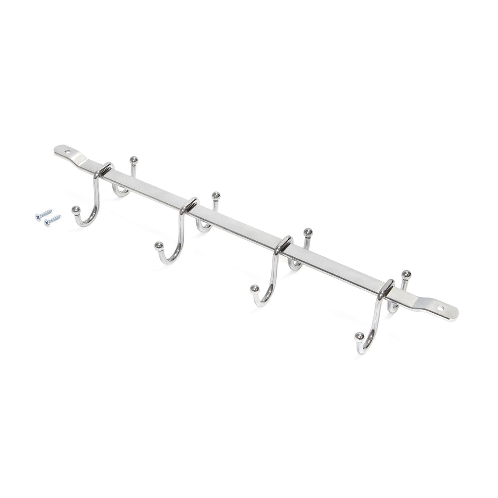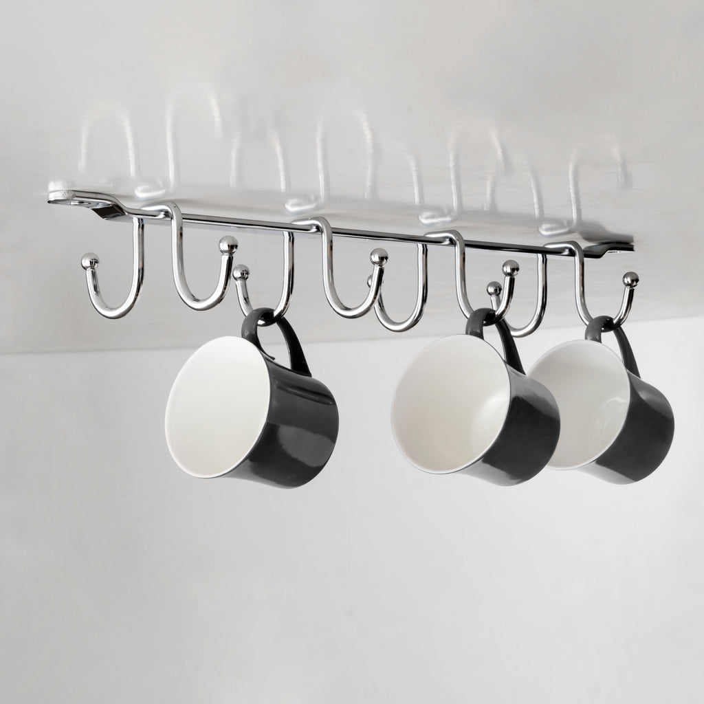 Getränkehalter mit 8 Haken für Küchenmöbel Es ist ein Kleiderbügel, der Ihnen hilft, Ihre Küchenutensilien zu organisieren und den verfügbaren Platz in den Möbeln, unter den Regalen oder Theken im Haus, in der Küche, in der Bar oder im Restaurant zu optimieren. Dank seiner Konstruktion aus verchromtem Stahldraht passt er sich jedem Küchenstil an. Es zeichnet sich durch seine einfache Installation im Möbel mit den im Kit enthaltenen Schrauben aus.