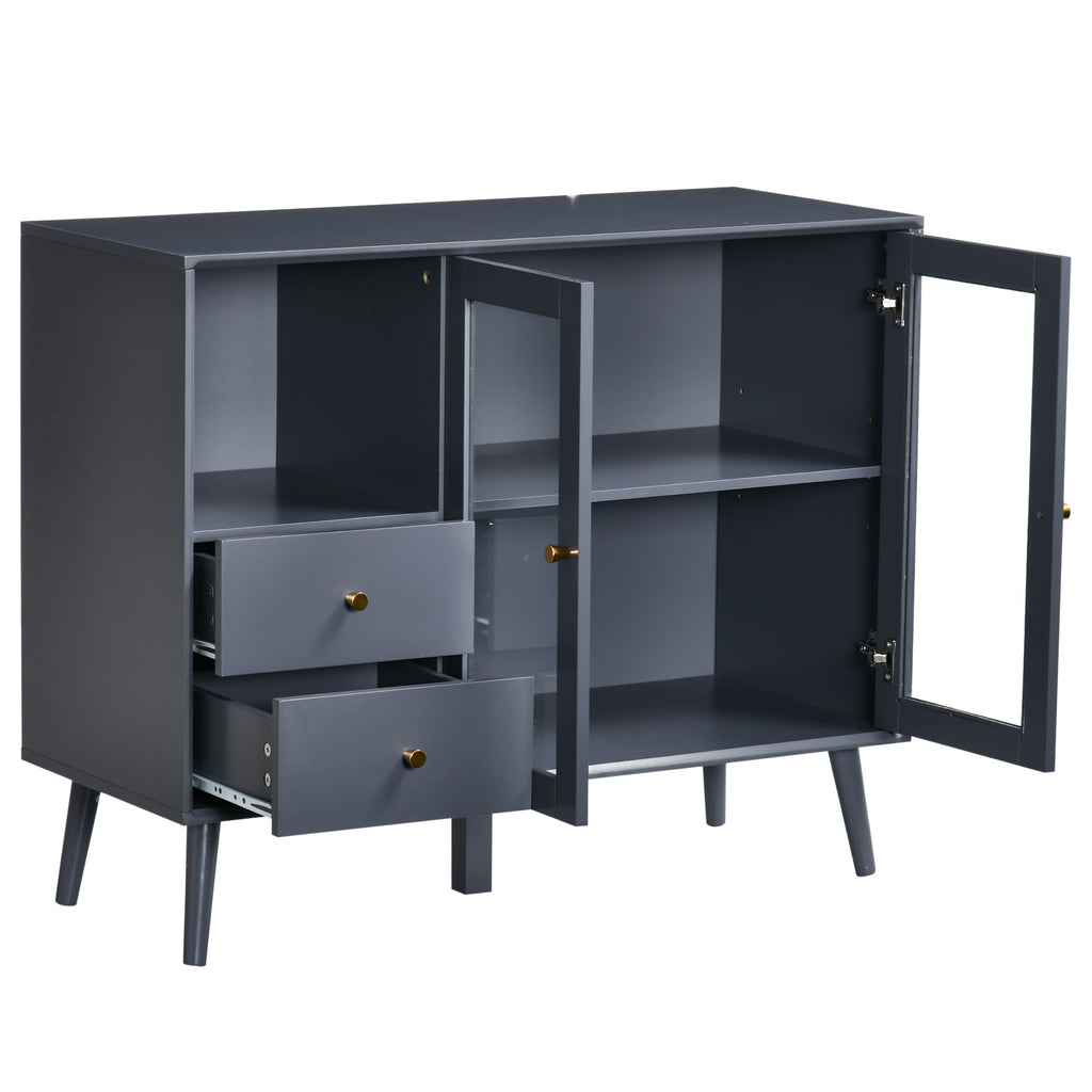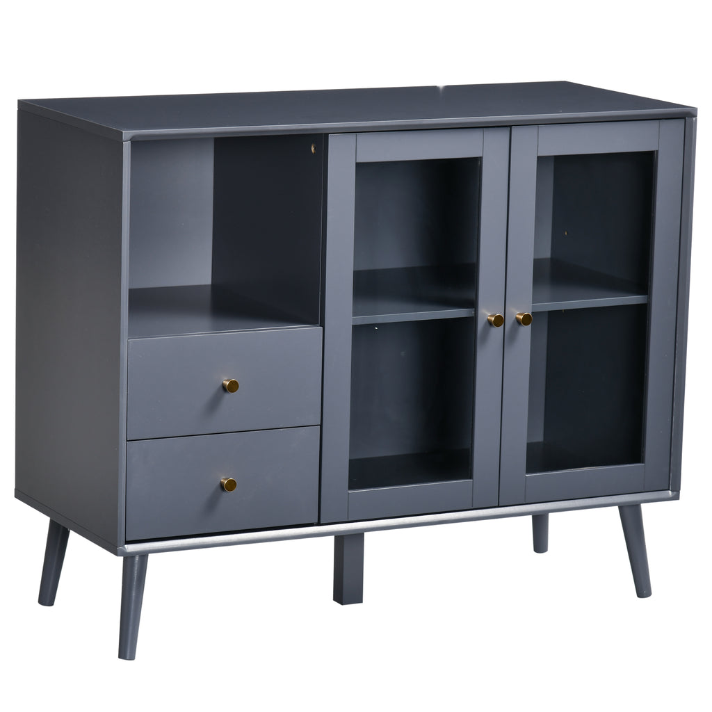 Schrank 95,5 x 40 x 78 cm, 2 Glastüren, 2 Schubladen und graues Regal