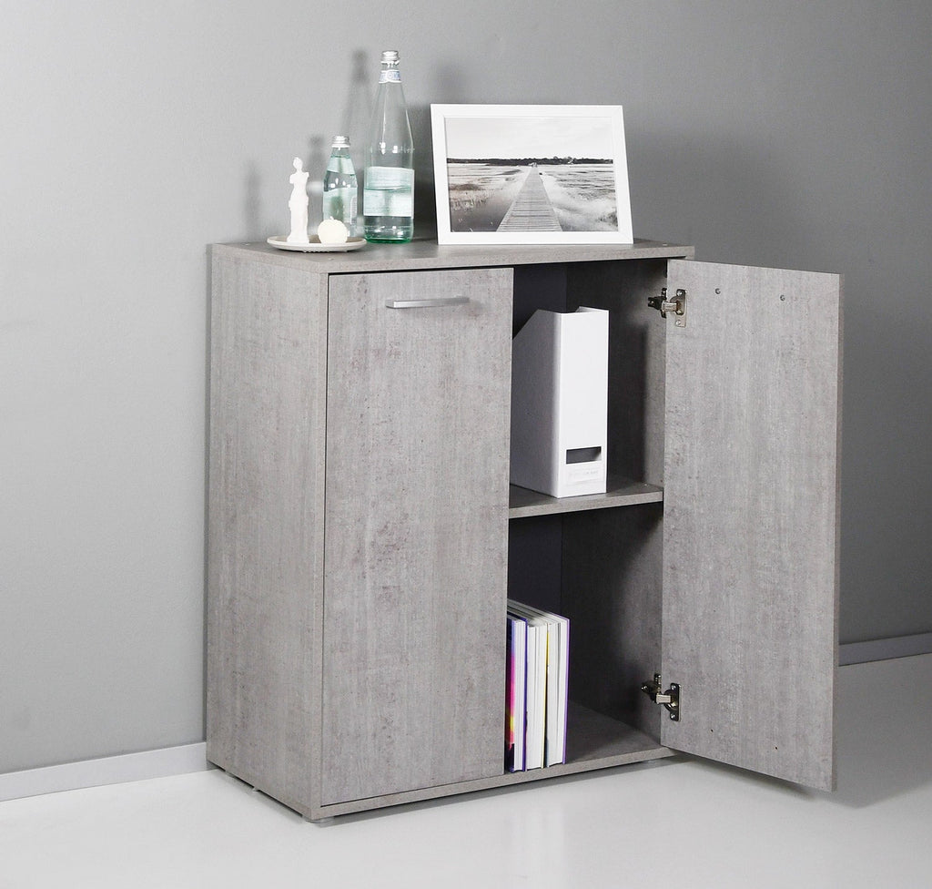 Mobiletto versatile, multiuso e dalla qualità 100% Made in Italy utile in soggiorno come piccola credenza per sistemare le stoviglie, in camera da letto come armadietto, all'ingresso oppure in ufficio per conservare documenti e materiale da cancelleria. Superficie rivestita con resina melaminica rende il mobile resistente all'uso quotidiano, agli urti e ai graffi. Il colore grigio effetto cemento dona invece un tocco più moderno all'ambiente e si adatta facilmente a tanti tipi di arredo.