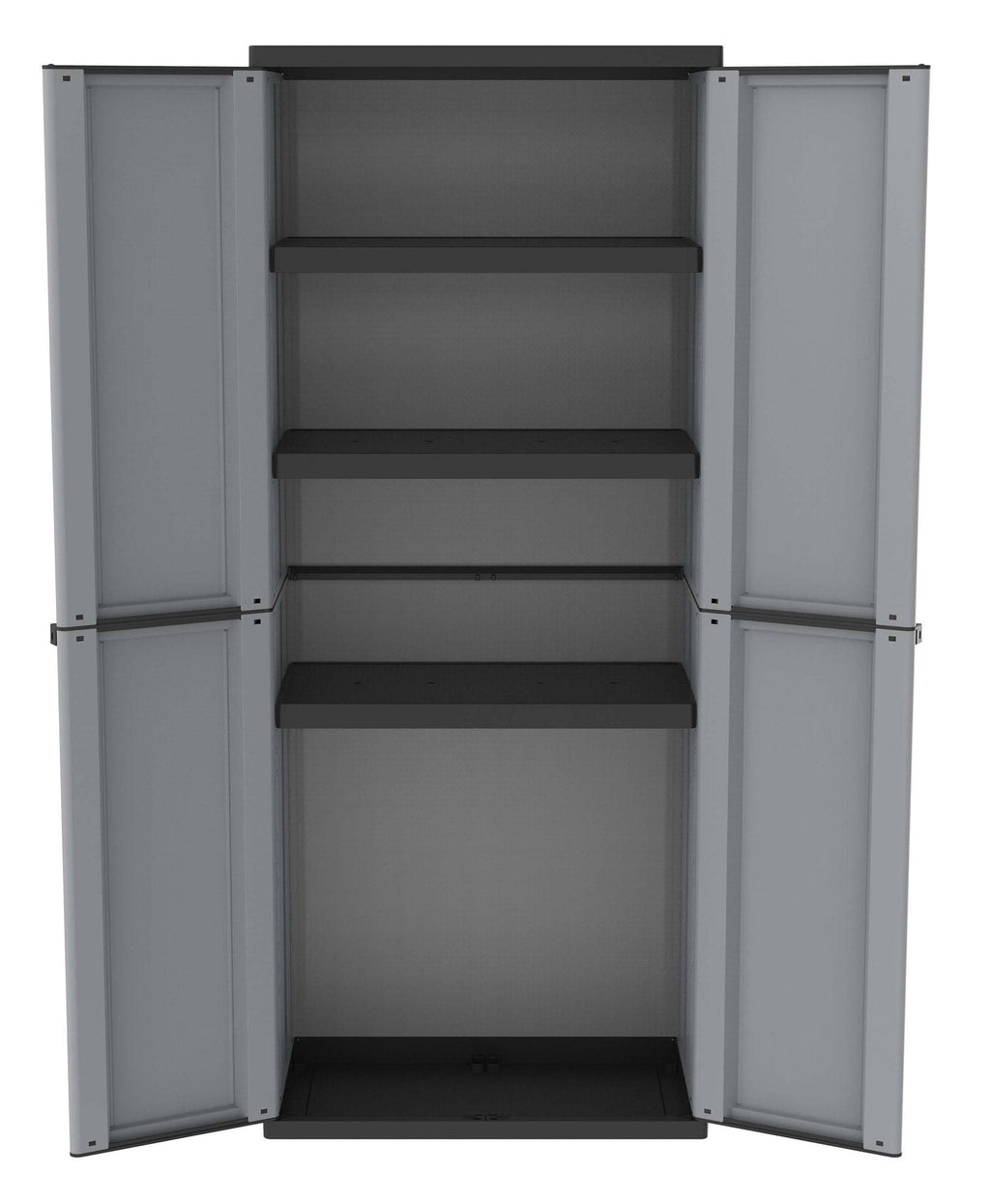 Armadio a 2 ante con 3 ripiani interni regolabili. Pratica apertura delle ante fino a 180°. Realizzato in Polipropilene con possibilità di chiusura con lucchetto