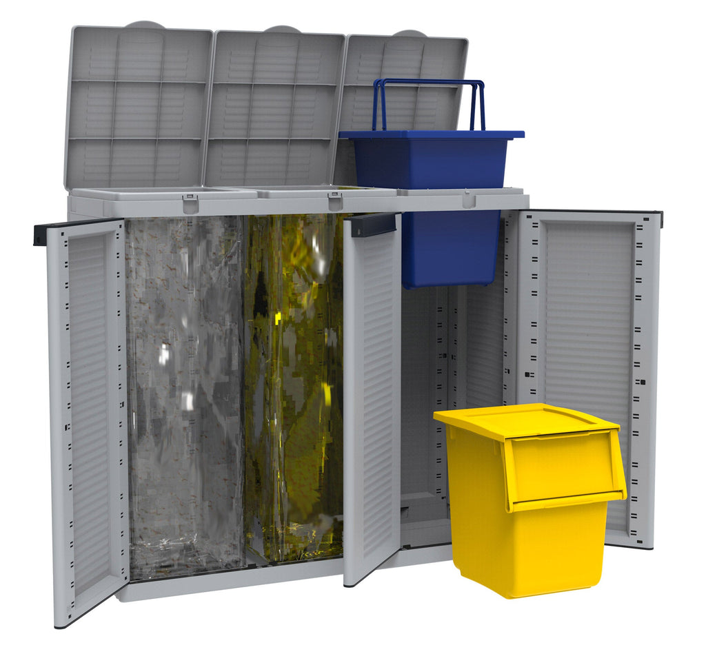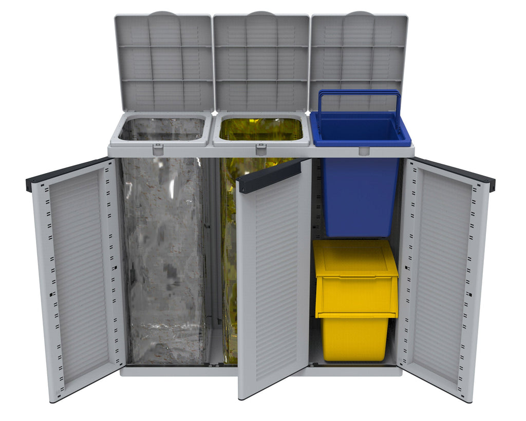 Armadietto a 3 ante ideato per la raccolta differenziata dei rifiuti e dotato di tre porta-sacco chiudibili con coperchio. L'apertura delle ante permette una facile estrazione frontale dei sacchi pieni, ciò lo rende adatto per coloro che hanno problemi di spazio. Materiale in Polipropilene