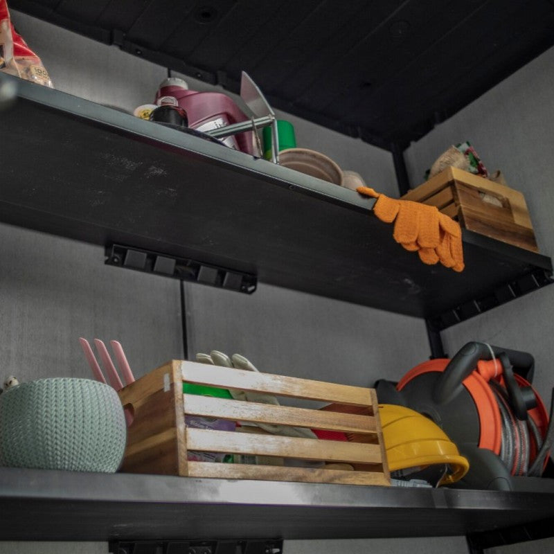 Duotech-Wände sind auch perfekt streichbar und bieten endlose Anpassungsmöglichkeiten. Das Fassungsvermögen von 1400 Litern bietet ausreichend Platz, um Möbel und Kissen, Poolausrüstung oder Rasenmäher zu verstauen, während das starke Dach perfekt für die Aufbewahrung von Mutterschafts- oder Gartenwerkzeugen ist. Schwere Gegenstände können dank des geneigten Eingangs aus dem Gerät entfernt oder bewegt werden.