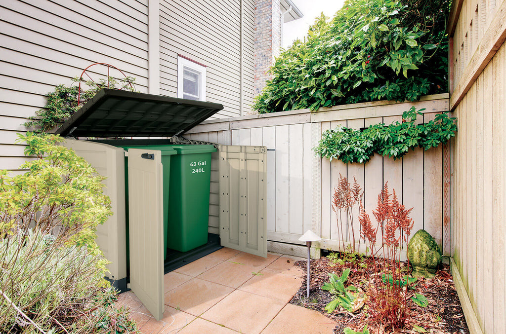 Store-It-Out Max ist einfach zu verwenden und zu montieren und ist die ideale Lösung zum Aufbewahren von beispielsweise Grills und Werkzeugen. Kompakt und vielseitig, beständig gegen Witterungseinflüsse und mit einem Fassungsvermögen von bis zu 1200 Litern. Zwei Öffnungen: eine auf der Vorderseite und eine auf der Oberseite, Tretverschluss und Kit zur Befestigung der Behälter am Deckel.