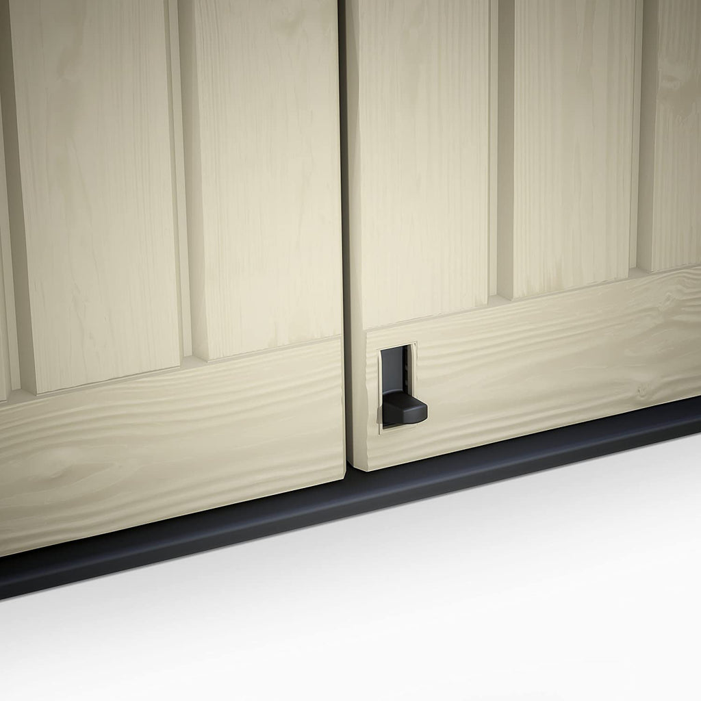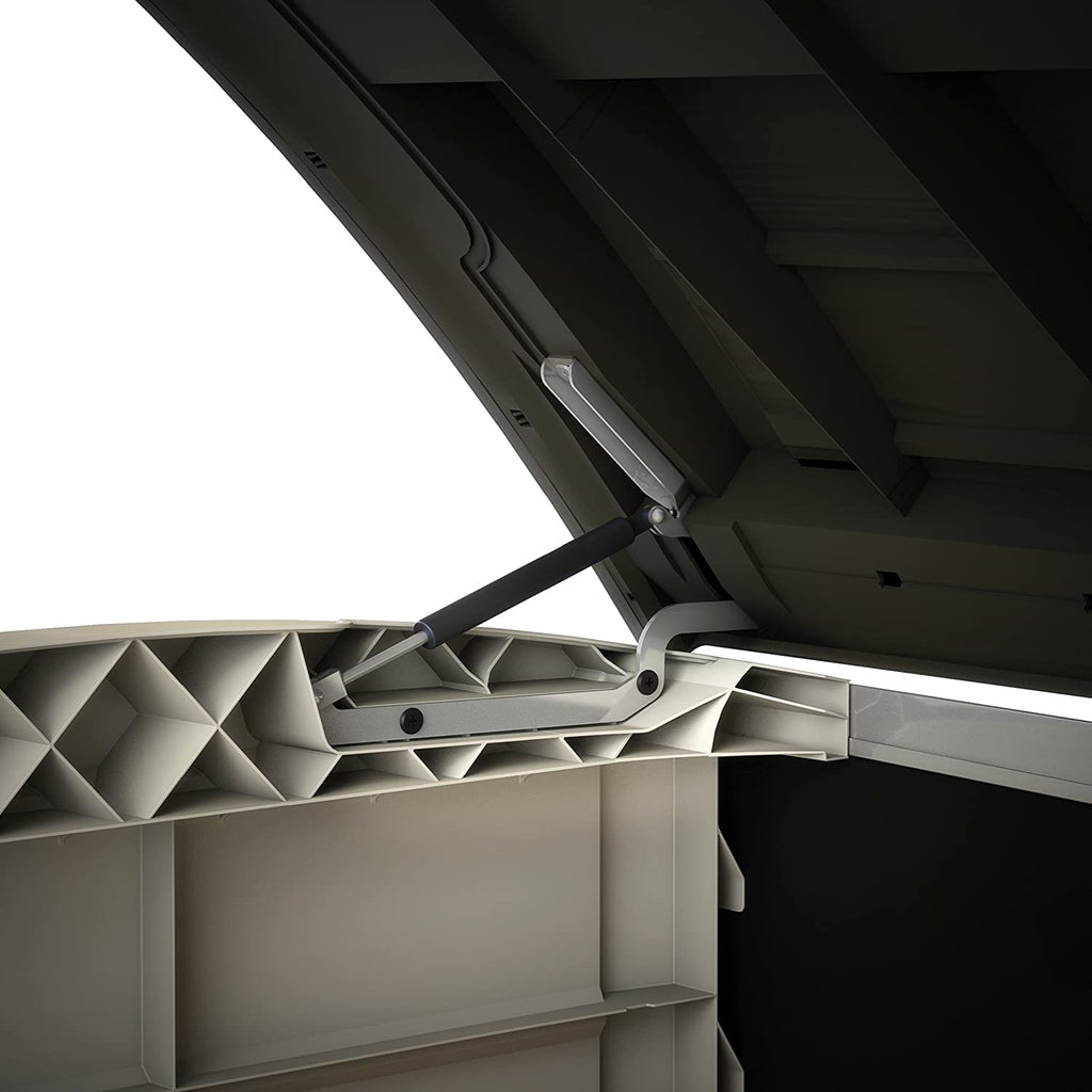 Store-It-Out ARC ist eine Werkzeugkiste mit großem Fassungsvermögen, mit der Sie bis zu 1200 l Inhalt organisieren und trocken halten können, dank der soliden Struktur und der witterungsbeständigen Materialien. Es kann von oben oder von vorne geöffnet werden, der Deckel hat eine unterstützte Öffnung und die Frontrampe macht es sehr einfach, sehr sperrige und/oder schwere Gegenstände zu lagern. Die Struktur kann bis zu 2 x 240-l-Mülltonnen aufnehmen und verfügt über integrierte Stützen für ein zusätzliches Regal (nicht im Lieferumfang enthalten), was sie ideal für die Aufbewahrung von Grillzubehör bis hin zu Gartenmöbeln macht.
