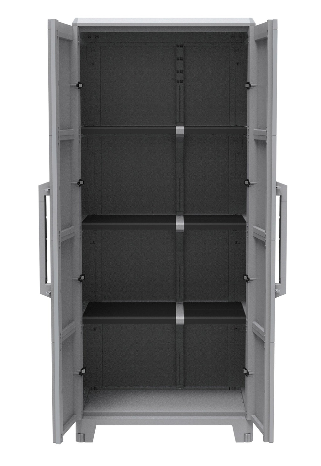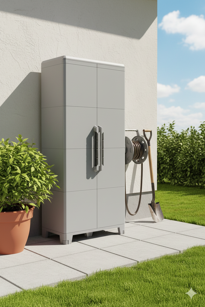 Armadio a 2 ante, con sistema modulabile interno ideale per esterno e impermeabile (certificato IP43). Dotato di cerniere in metallo antivento e protezione dai raggi UV. Fondo rinforzato con 6 piedini (2 frontali regolabili) e 2 ripiani modulabili di grande portata. Realizzato in Polipropilene con maniglia in bicomponente. Possibilità di chiusura con lucchetto.