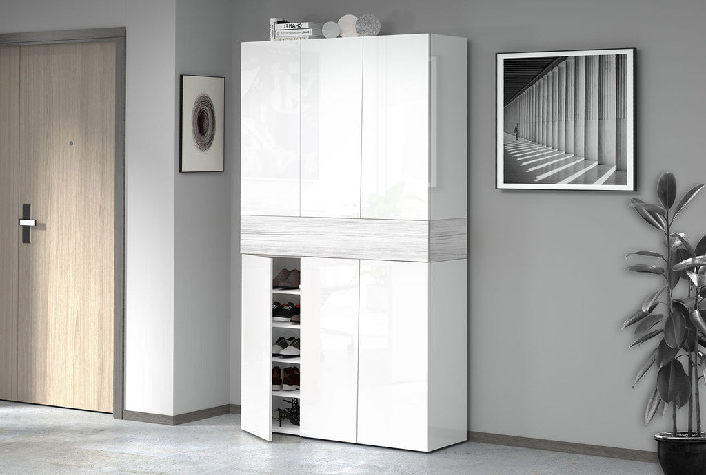 L'armadio scarpiera SAVONA con 6 ante battenti e 1 anta ribalta si distingue per la sua misura compatta, e per la sua eleganza e originalità. Questo mobile rappresenta una soluzione raffinata ed efficace per organizzare lo spazio e sistemare un grande numero di scarpe. Grazie al suo design versatile, questa scarpiera è ideale per essere collocata non solo negli ingressi e nei corridoi, ma anche nei soggiorni, aggiungendo un tocco di unicità all'ambiente. La sua struttura prevede un frontale bicolore, caratterizzato da un'anta a ribalta che funge da comodo portaoggetti. L'interno spazioso è dotato di 8 ripiani, in grado di accogliere fino a 60 paia di scarpe, permette di organizzare in maniera ottimale le proprie scarpe, che saranno anche semplici da raggiungere. Con le sue dimensioni di 114 x 35 x 200 cm e un peso di 107 kg, questa scarpiera, completamente Made in Italy e realizzata con materiali in legno riciclato, combina design moderno, funzionalità e qualità artigianale. Semplice da montare, viene fornita in un intuitivo kit con chiare istruzioni di montaggio. L'armadio scarpiera SAVONA a 6 ante battenti e 1 anta ribalta è uno dei prodotti più particolari che puoi trovare sul mercato. Grazie al suo design originale e alla qualità 100% Made in Italy, rappresenta un'opzione eccezionale per chi cerca una soluzione versatile e originale per organizzare le proprie calzature. La sua struttura sviluppata in verticale consente di sfruttare al massimo lo spazio disponibile, offrendo una soluzione ampia e funzionale. Disponibile in diverse varianti di colore, tra cui bianco laccato/bianco larice, bianco/report e bianco/rovere, questo armadio scarpiera si adatta facilmente a diversi stili d'arredamento. Questo completo d'arredo unisce estetica e praticità, permettendo di organizzare tutte le scarpe in maniera ottimale.