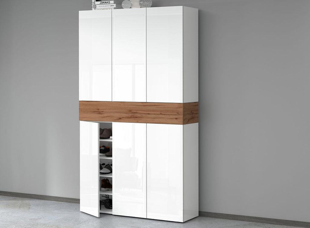 L'armadio scarpiera SAVONA con 6 ante battenti e 1 anta ribalta si distingue per la sua misura compatta, e per la sua eleganza e originalità. Questo mobile rappresenta una soluzione raffinata ed efficace per organizzare lo spazio e sistemare un grande numero di scarpe. Grazie al suo design versatile, questa scarpiera è ideale per essere collocata non solo negli ingressi e nei corridoi, ma anche nei soggiorni, aggiungendo un tocco di unicità all'ambiente. La sua struttura prevede un frontale bicolore, caratterizzato da un'anta a ribalta che funge da comodo portaoggetti. L'interno spazioso è dotato di 8 ripiani, in grado di accogliere fino a 60 paia di scarpe, permette di organizzare in maniera ottimale le proprie scarpe, che saranno anche semplici da raggiungere. Con le sue dimensioni di 114 x 35 x 200 cm e un peso di 107 kg, questa scarpiera, completamente Made in Italy e realizzata con materiali in legno riciclato, combina design moderno, funzionalità e qualità artigianale. Semplice da montare, viene fornita in un intuitivo kit con chiare istruzioni di montaggio. L'armadio scarpiera SAVONA a 6 ante battenti e 1 anta ribalta è uno dei prodotti più particolari che puoi trovare sul mercato. Grazie al suo design originale e alla qualità 100% Made in Italy, rappresenta un'opzione eccezionale per chi cerca una soluzione versatile e originale per organizzare le proprie calzature. La sua struttura sviluppata in verticale consente di sfruttare al massimo lo spazio disponibile, offrendo una soluzione ampia e funzionale. Disponibile in diverse varianti di colore, tra cui bianco laccato/bianco larice, bianco/report e bianco/rovere, questo armadio scarpiera si adatta facilmente a diversi stili d'arredamento. Questo completo d'arredo unisce estetica e praticità, permettendo di organizzare tutte le scarpe in maniera ottimale.