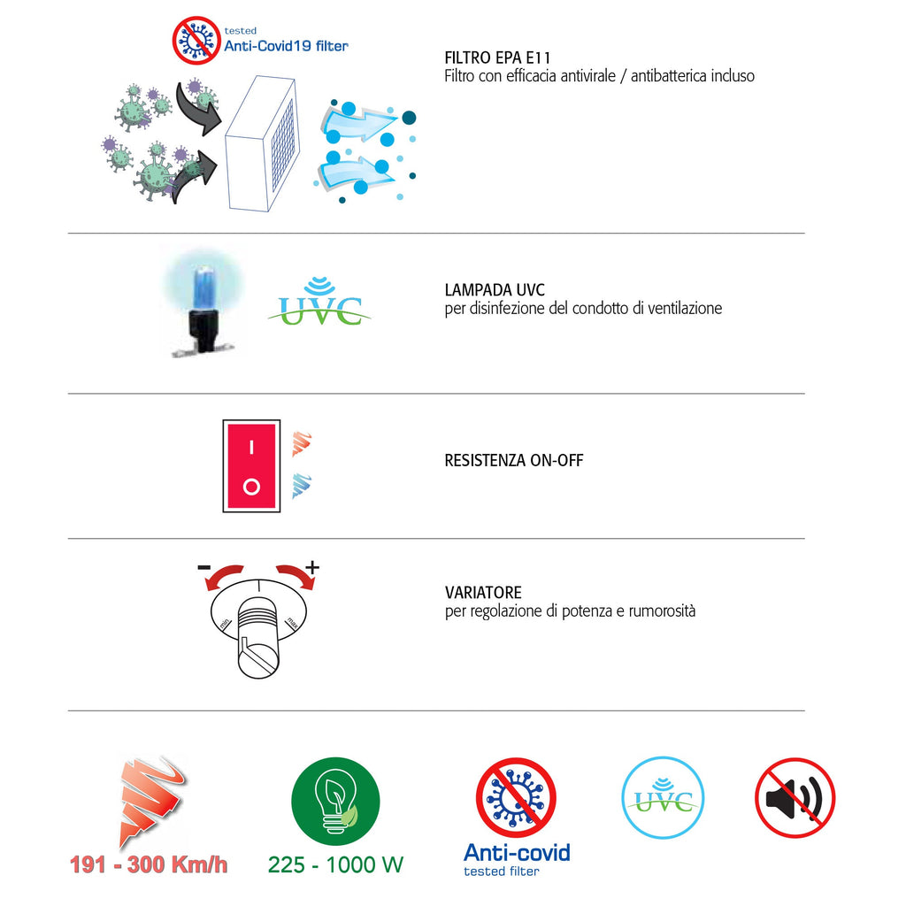 ECO - JET elektrischer Händetrockner, superschnell und sehr energieeffizient, mit einstellbarem Widerstand. Variator zur Regulierung der zugeführten Leistung (Luftgeschwindigkeit und Lärm) und Anti-Covid-getesteter Filter und UV-C-Lampe als Standardausrüstung.