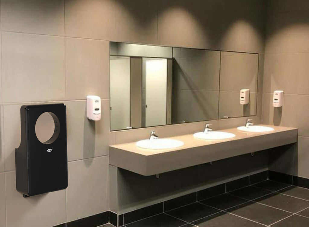 Rundstrahl-Händetrockner . Maximale Hygiene durch das Fehlen von Berührungspunkten mit den Händen und die spezielle antibakterielle ABS-Lackierung.