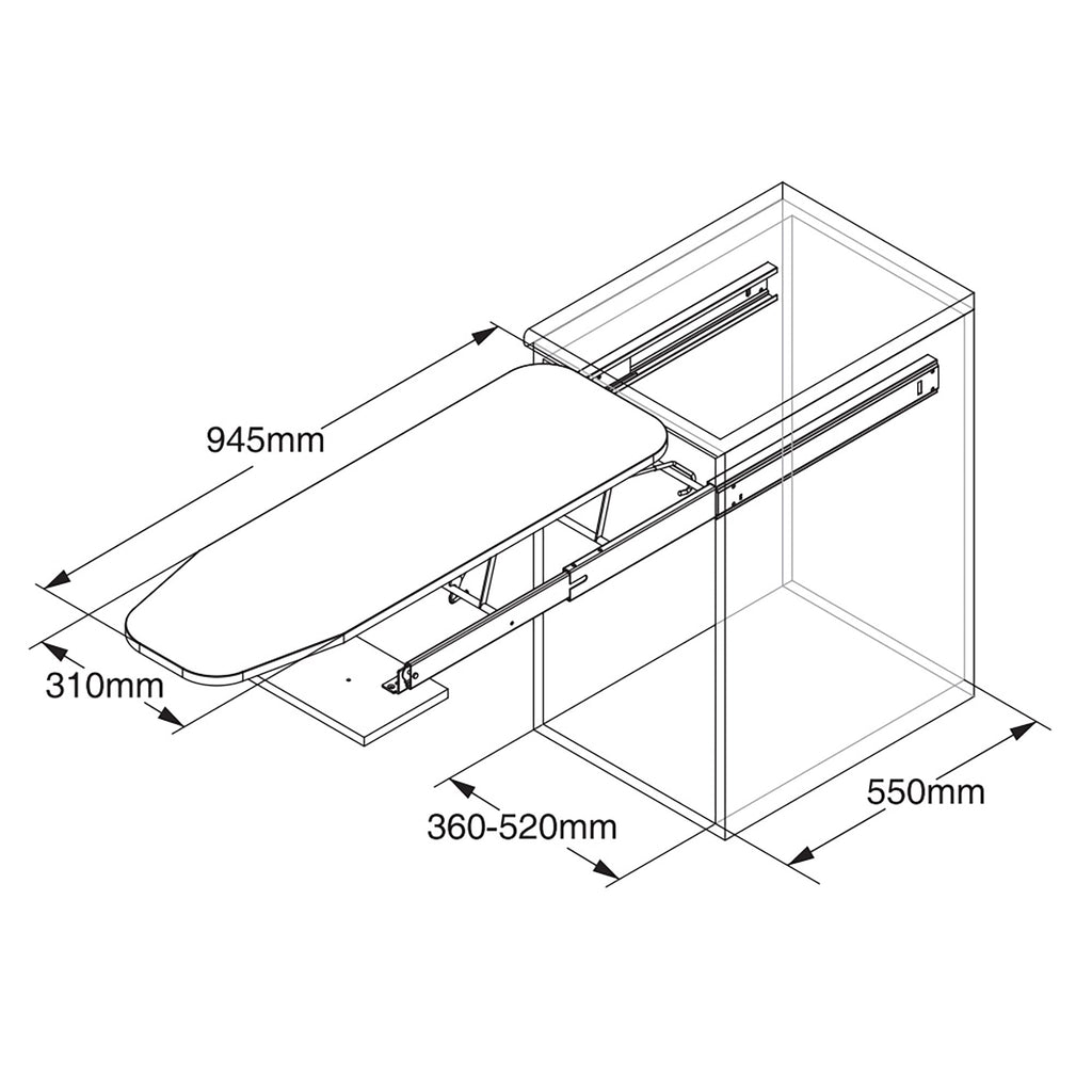 - Ausziehbares Bügelbrett zur Montage im Küchenmodul integriert.