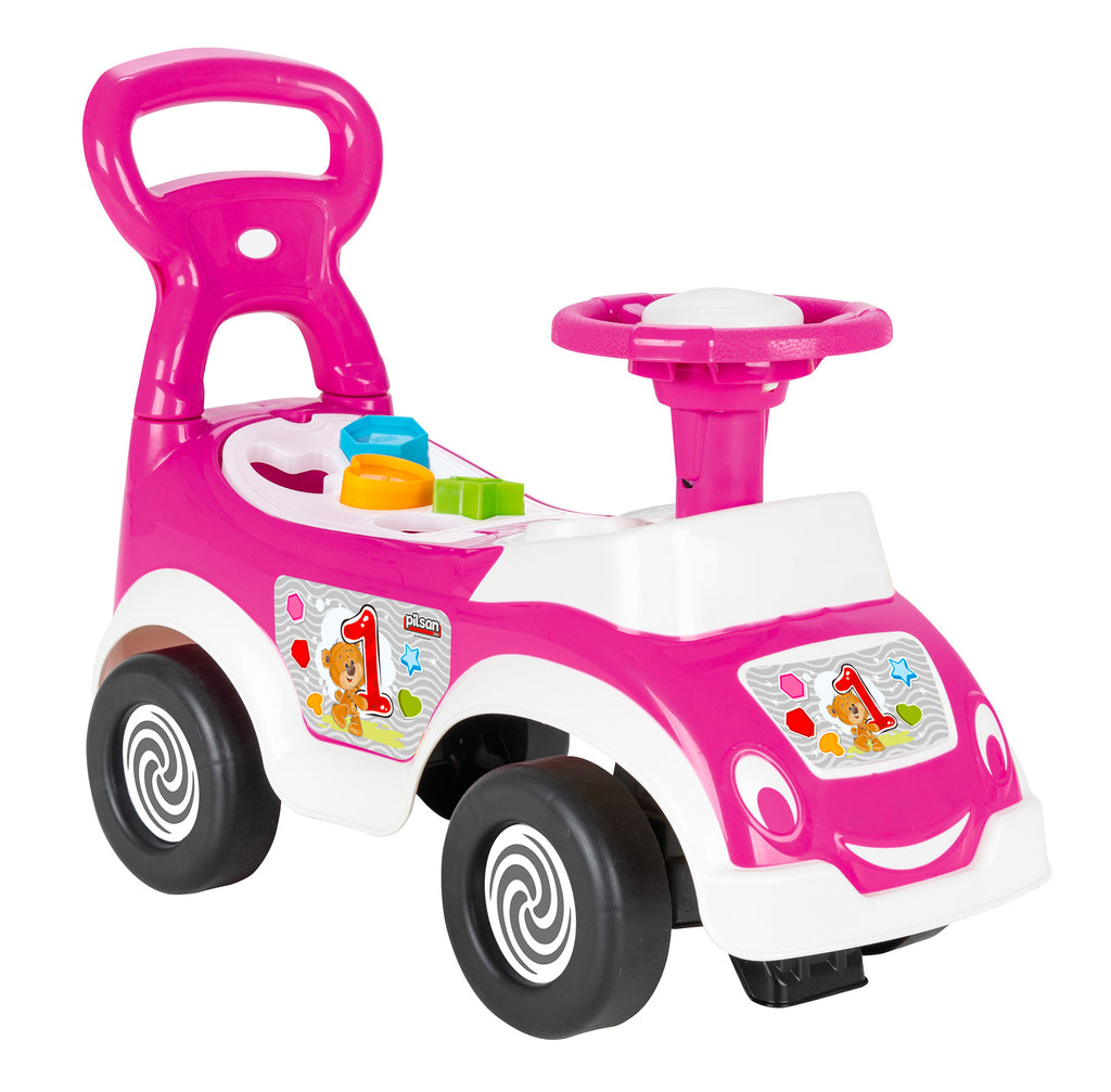 Macchina Cavalcabile per Bambini dotato di un volante con un clacson a soffietto e una comoda maniglia per spostarsi con facilità. Il sedile è caratterizzato da diverse sagome e figure che i bambini possono inserire, sviluppando così la loro coordinazione mano-occhio. Inoltre, c'è un vano portaoggetti sotto il sedile dove i piccoli possono conservare i loro tesori. Le dimensioni del gioco sono di 78x29,5x54 cm, offrendo uno spazio sufficiente per il divertimento e l'apprendimento.