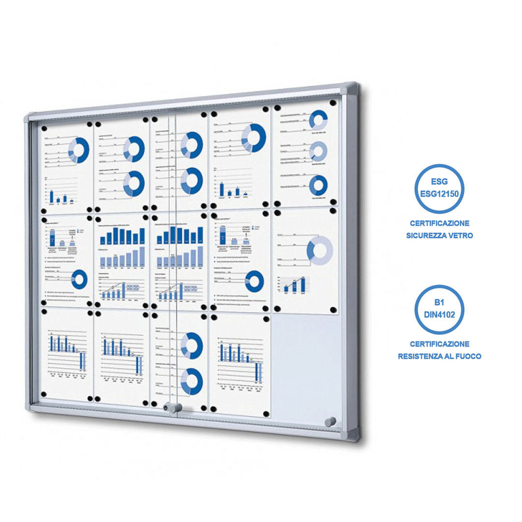 Questa bacheca per interni magnetica è ideale per organizzare informazioni e comunicazioni in ambienti interni. Realizzata con profili in alluminio anodizzato silver, presenta angoli di sicurezza in ABS per garantire la protezione dagli urti. La superficie è in acciaio laccato magnetica e scrivibile, consentendo di attaccare documenti e scrivere note direttamente sulla bacheca. Le ante scorrevoli in vetro temperato da 4 mm offrono un design elegante e moderno, mentre la chiusura a serratura garantisce la sicurezza dei contenuti. Con un kit per il fissaggio a parete incluso e il formato di 15xA4, le dimensioni della bacheca sono di 116x98,2x5,9 cm. Inoltre, il vetro temperato ESG è certificato e classificato ignifugo B1, garantendo la massima sicurezza.