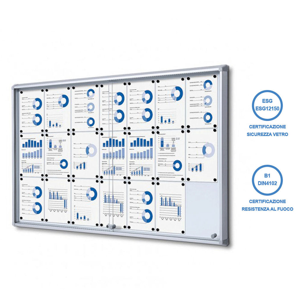 La bacheca magnetica per interni è realizzata in alluminio anodizzato silver, conferendo un aspetto elegante e resistente. Dotata di angoli di sicurezza in ABS, assicura una maggiore durata nel tempo. La superficie scrivibile e laccata in acciaio magnetico consente di appuntare e scrivere note ed appunti in modo semplice e pratico. Le ante in vetro temperato di 4 mm, scorrevoli e con serratura, garantiscono sicurezza e protezione degli oggetti all'interno. Certificata vetro temperato ESG ignifuga B1, è inclusa il kit di fissaggio a parete. Con formato 21xA4, le dimensioni della bacheca sono di 160x98,2x5,9 cm, offrendo uno spazio ampio e organizzato per l'esposizione di documenti e comunicazioni.