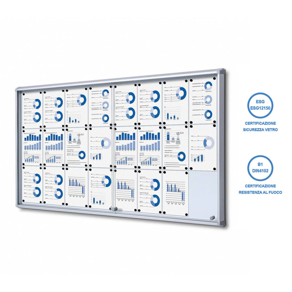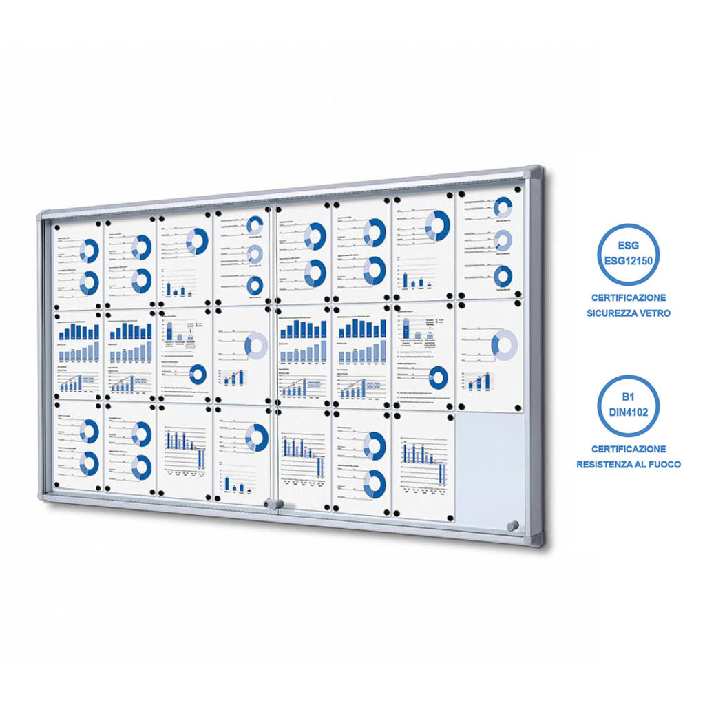 La bacheca interna magnetica è realizzata in resistente alluminio silver con angoli di sicurezza in ABS. La superficie della bacheca è in acciaio laccato magnetico, ideale per attaccare facilmente note o documenti con magneti. Le ante scorrevoli, realizzate in vetro temperato spesso 4mm, rendono la bacheca elegante e permettono di scrivere sopra la superficie magnetica. La bacheca è certificata con vetro ESG temperato e ignifuga B1, garantendo sicurezza e resistenza al fuoco. Il kit di fissaggio a parete è incluso e il formato della bacheca è di 24xA4, con dimensioni di 181,5x98,2x5,9 cm.