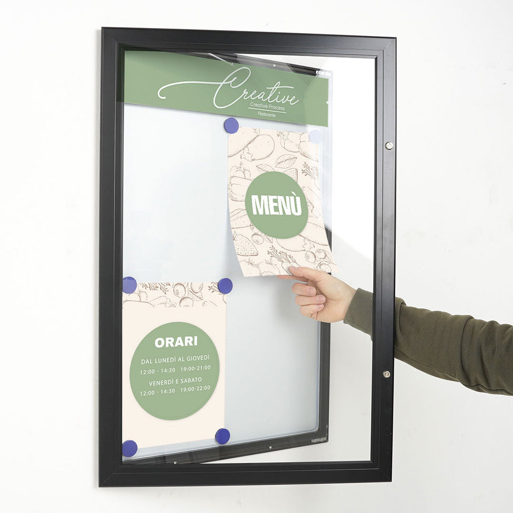 La bacheca per esterni è realizzata in alluminio verniciato a polveri nero, garantendo resistenza agli agenti atmosferici. Il fondo della bacheca è in acciaio laccato magnetico, consentendo di scrivervi sopra con facilità. L'anta è trasparente e realizzata in policarbonato, consentendo la visualizzazione dei documenti all'interno della bacheca. L'apertura a battente è dotata di serratura con chiavi incluse. La bacheca ha anche un pannello di intestazione personalizzabile con logo o rimovibile. Il kit per il fissaggio a parete è incluso e comprende viti M3 e tasselli per fori da 6,5 mm. Il formato è 4xA4 e le dimensioni della bacheca sono 51,5x79,0x2,3 cm.