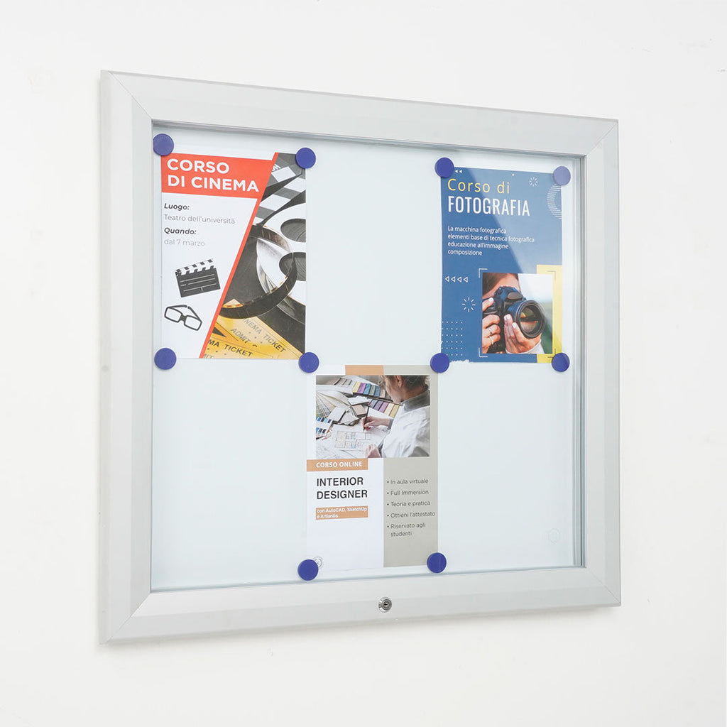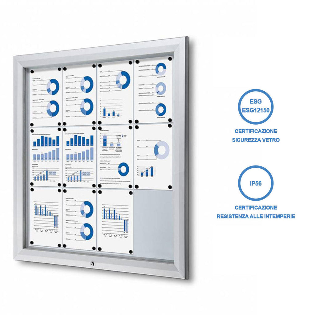 La bacheca per esterni è realizzata in alluminio estruso, con spigoli arrotondati e anodizzato silver. Il fondo magnetico è scrivibile e cancellabile, realizzato in acciaio laccato bianco. L'apertura a ribalta è in vetro temperato e dotata di serratura, fornita con 2 chiavi. La bacheca è certificata vetro temperato ESG e resistente all'acqua e alla polvere con livello di protezione IP56. L'apertura avviene tramite pistoni a gas e il kit per il fissaggio a parete è incluso. Il formato della bacheca è di 12xA4 e le dimensioni sono di 102,5x106,7x4,7 cm.