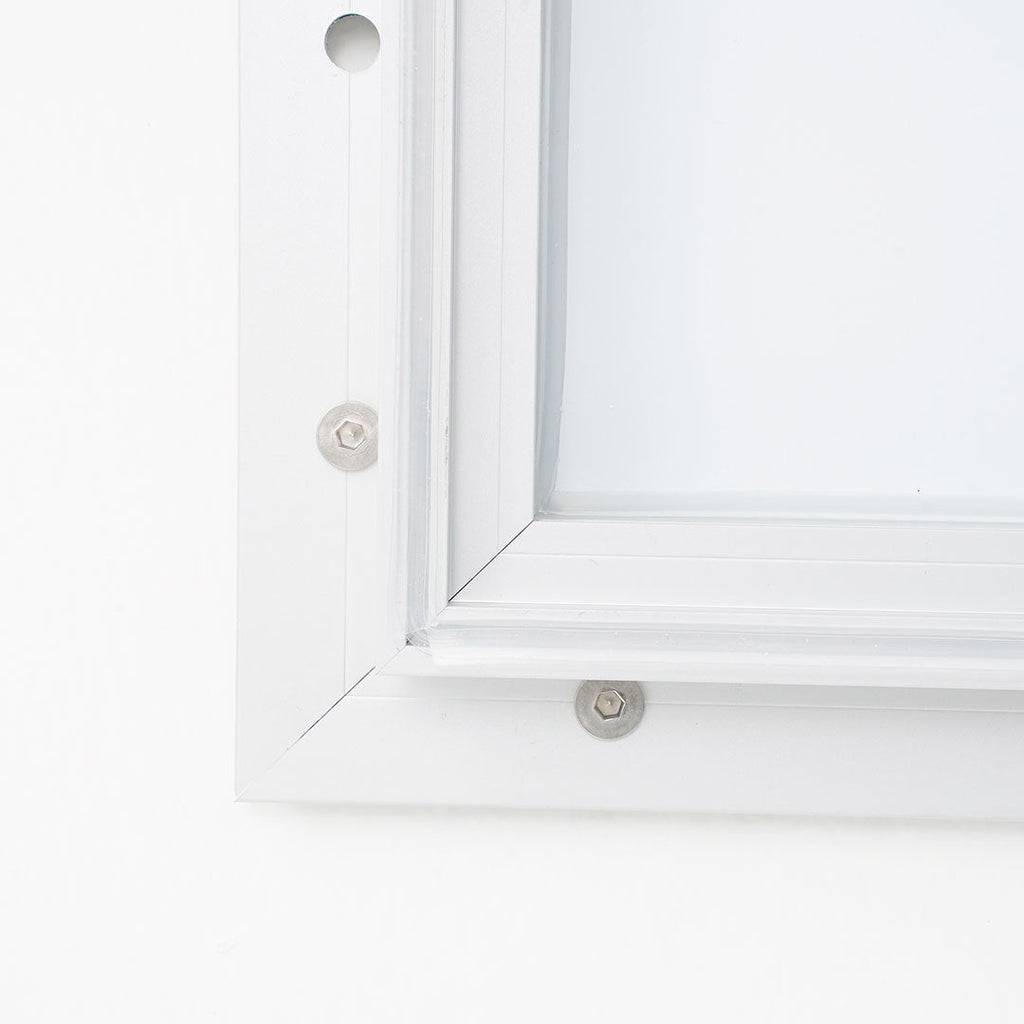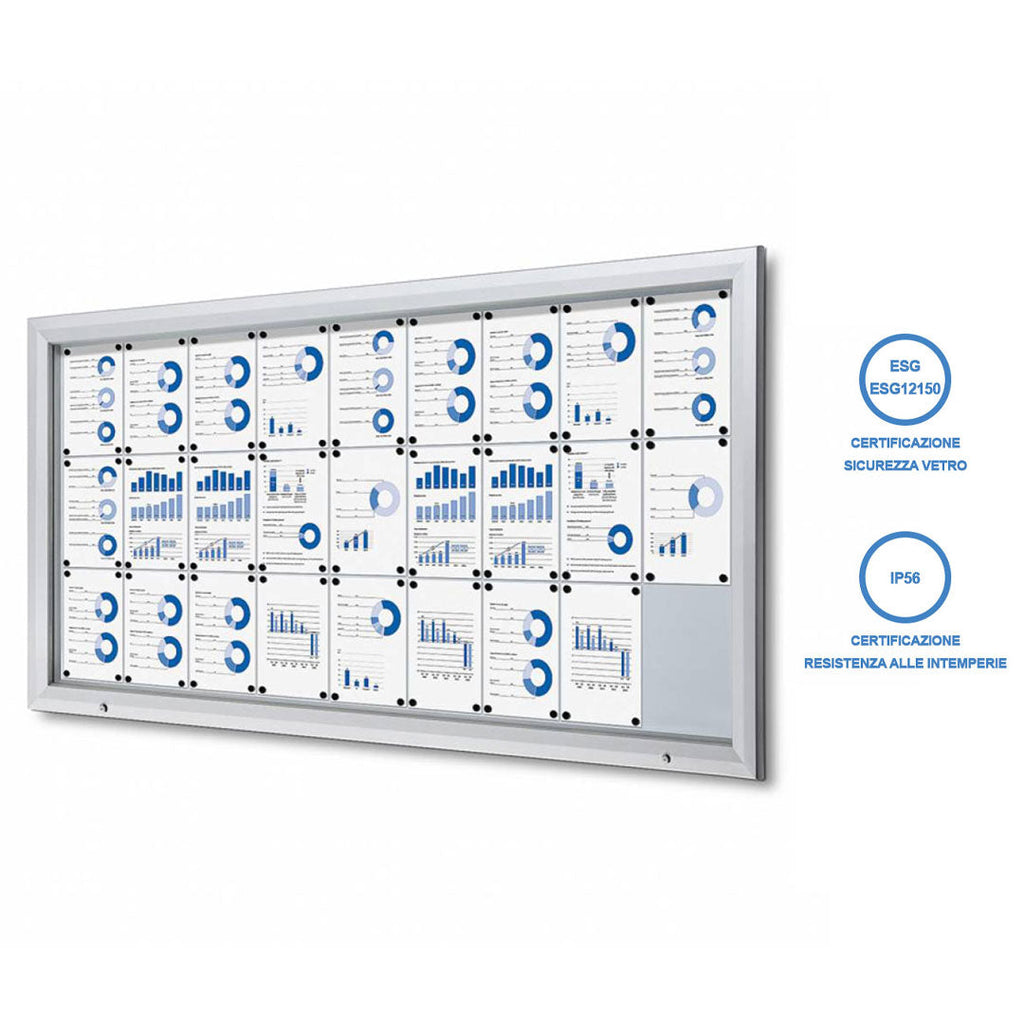 La bacheca per esterni è realizzata in alluminio estruso, con spigoli arrotondati e anodizzata silver. Il fondo magnetico è scrivibile e cancellabile, realizzato in acciaio laccato bianco. La bacheca ha un'apertura a ribalta in vetro temperato con serratura e viene fornita con due chiavi. È certificata come vetro temperato ESG e resistente all'acqua e alla polvere con grado IP56. L'apertura è facilitata da pistoni a gas e il kit per il fissaggio a parete è incluso. Il formato della bacheca è di 27xA4 e le dimensioni sono 212,5x106,7x4,7 cm.