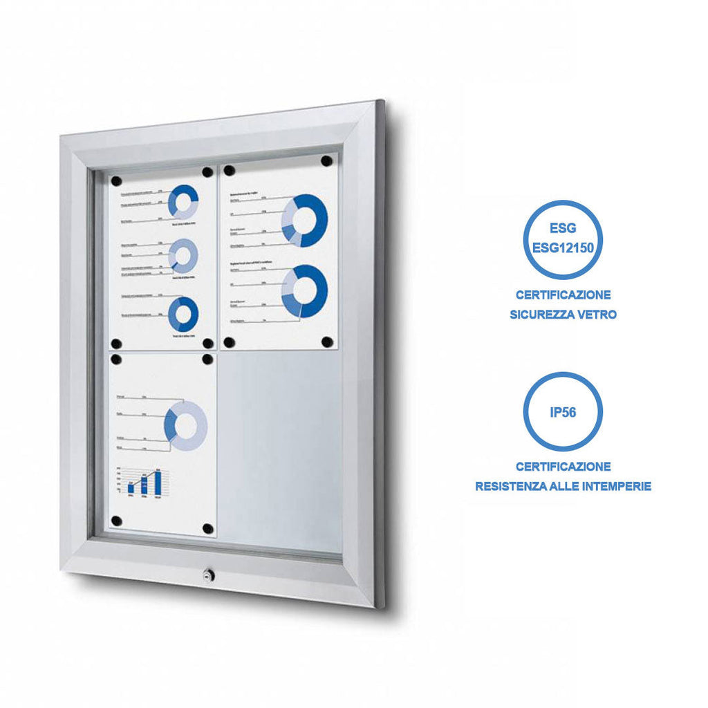 La bacheca per esterni è realizzata in alluminio estruso, con spigoli arrotondati e anodizzati in colore silver. Il fondo della bacheca è magnetico, scrivibile e cancellabile, realizzato in acciaio laccato bianco. L'apertura della bacheca avviene a ribalta, ed è realizzata in vetro temperato, dotata di serratura e fornita con 2 chiavi. La bacheca è certificata per la resistenza del vetro temperato ESG e all'acqua e alla polvere grazie al grado di protezione IP56. Viene fornita con pistoni a gas e kit di fissaggio a parete, ed ha un formato che può contenere fino a 4 fogli A4, con dimensioni complessive di 58,5x76x4,7 cm.