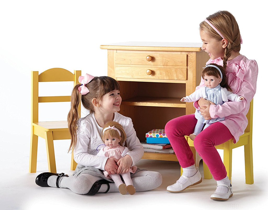 Puppe mit kämmbarem Haar, weichem Körper, Kopf und Gliedmaßen aus Vinyl, Baumwollkleid, Haarband, Pullover und Wollstrumpfhose, abnehmbaren Schuhen, Schlafaugen.
