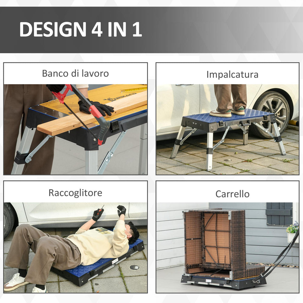 Die 4-in-1-Arbeitsplattform ist eine vielseitige Lösung, die Sie bei verschiedenen Aufgaben unterstützt. Sie können es als Werkbank, Gerüst, Unterwagenbett und Wagen verwenden. Die Struktur aus Aluminiumlegierung ist robust und langlebig, während die 4 Räder für eine reibungslose Bewegung sorgen. Wählen Sie diese multifunktionale Plattform als Assistent für all Ihre Arbeiten!