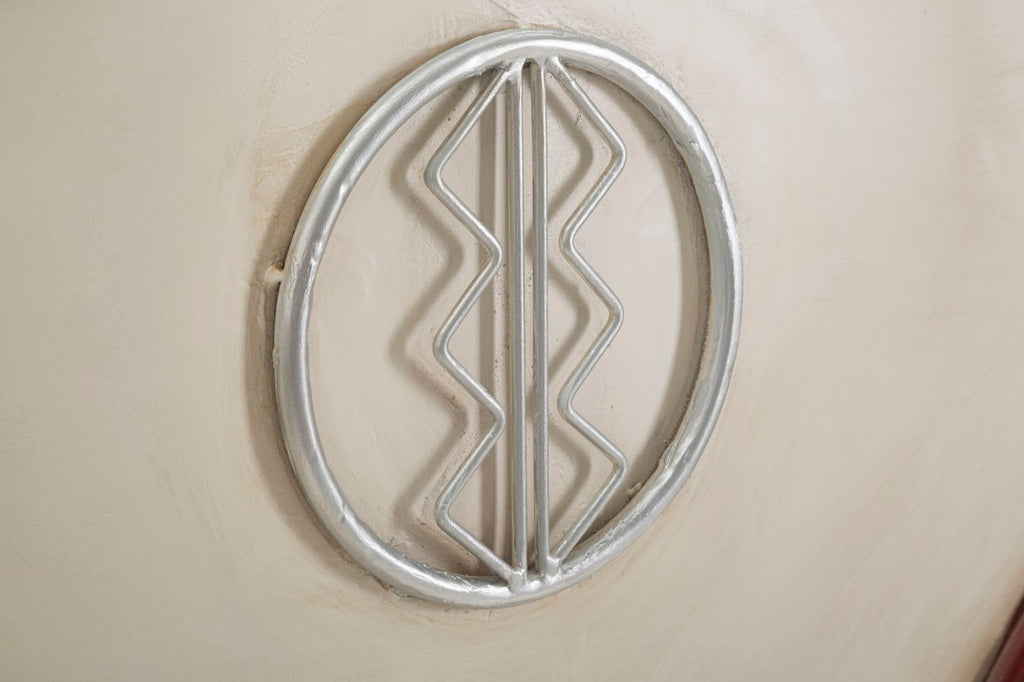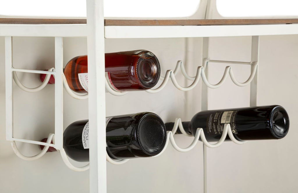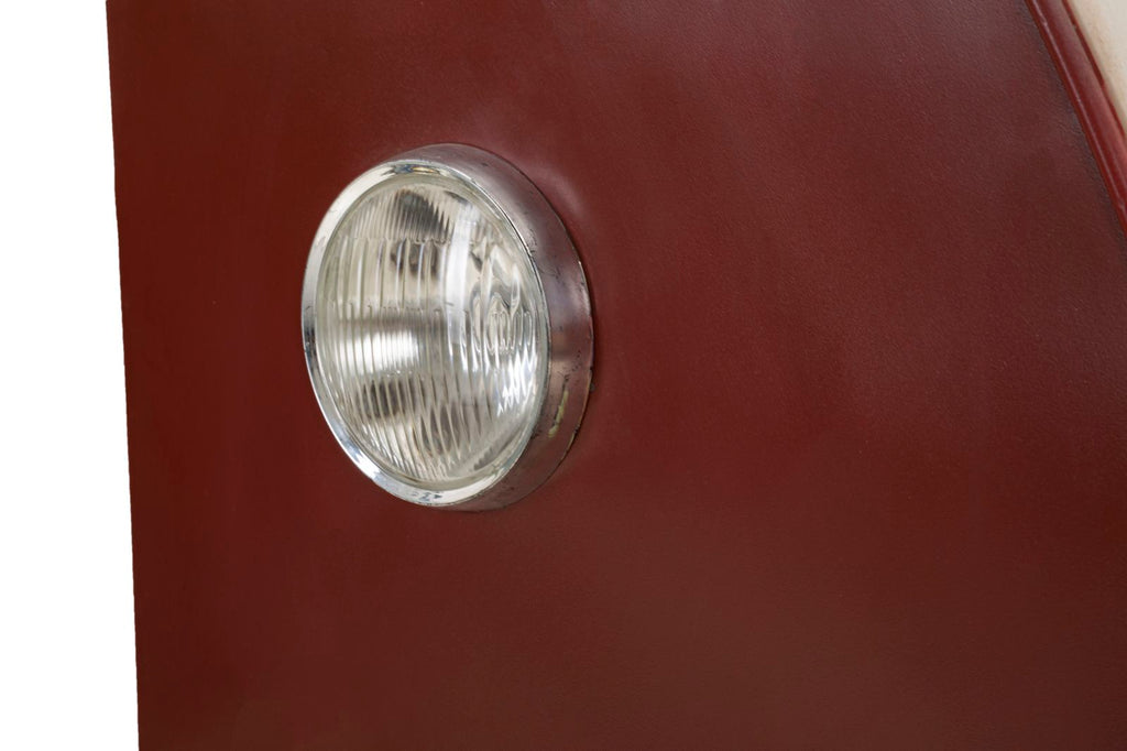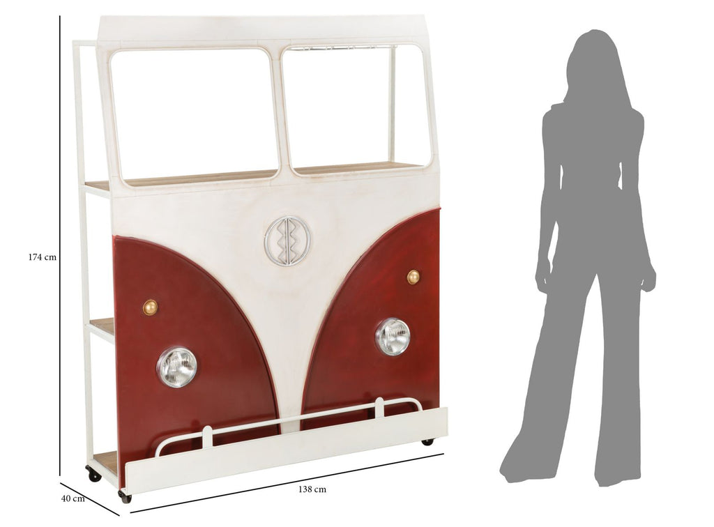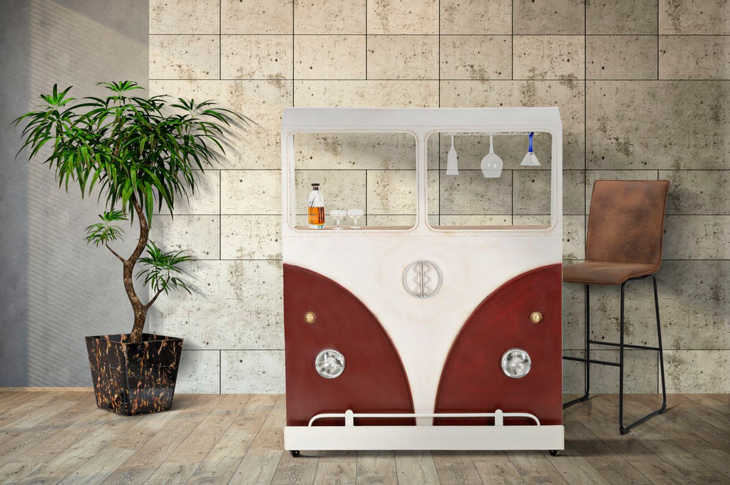 Bartheke aus Metall mit einem Design, das an einen klassischen Van der 60er Jahre erinnert, um dem Raum einen Vintage- und Industrie-Touch zu verleihen. Die Scheinwerfer sind nur dekorativ.