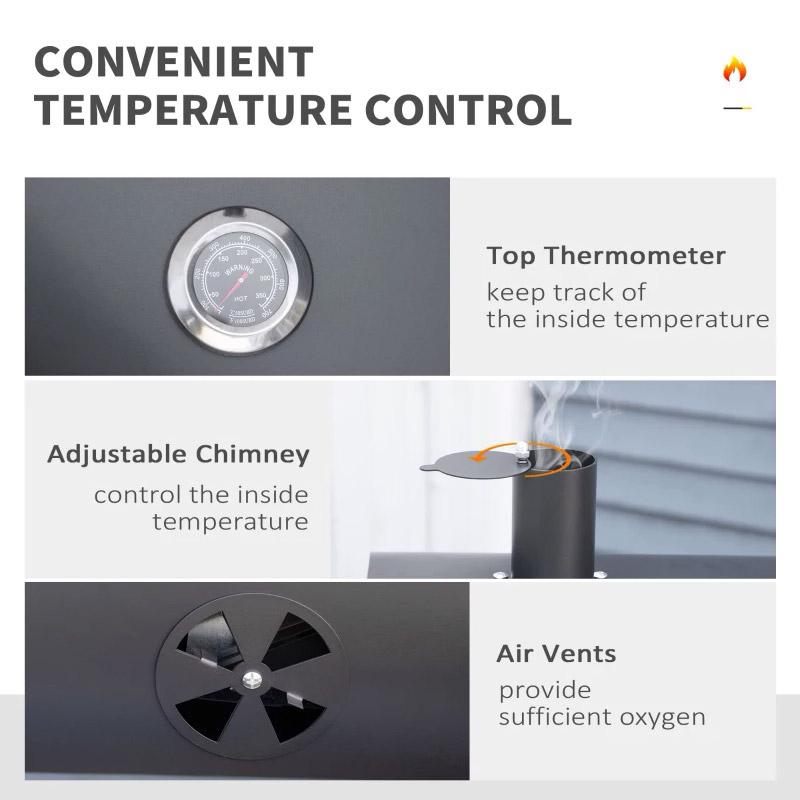 - TEMPERATURREGELUNG: Die Holzkohle ist durch Drehen der Kurbel höhenverstellbar und wird durch die vordere Tür hinzugefügt. Der integrierte Deckel hilft Ihnen, Wärme zu sparen und Ihren Speisen einen rauchigen Geschmack zu verleihen. Die einstellbare Entlüftung am Schornstein und das Thermometer am Deckel helfen auch bei der Kontrolle der Innentemperatur des Grills