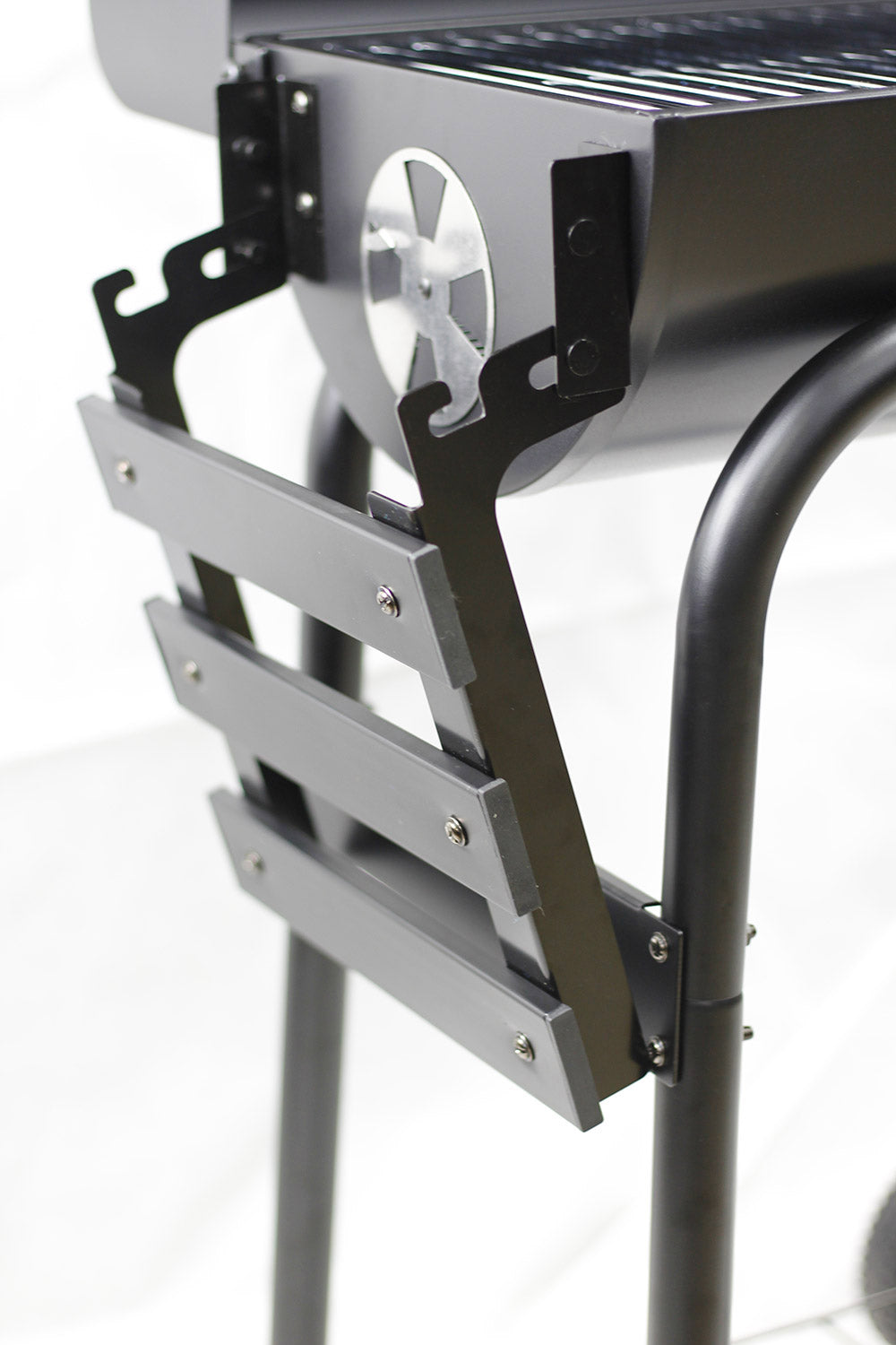 Saturnino Barbecue con Affumicatore offre un'esperienza di grigliata completa. Con braciere in acciaio resistente al calore, griglia in acciaio inox AISI 430 e coperchio con termometro. Altezza di cottura di 80 cm, ripiano laterale pieghevole e 2 ruote per la movimentazione. Dimensioni: 84x48x116h cm.