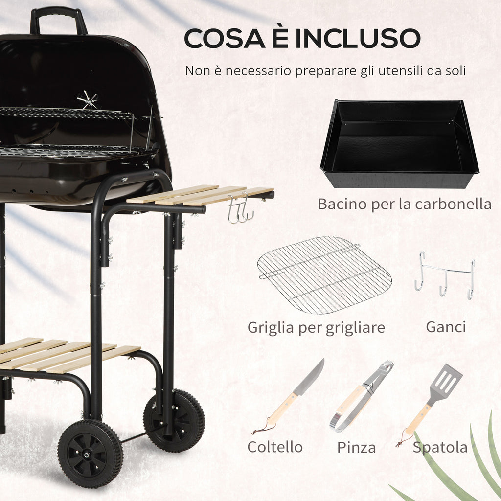 Barbecue a Carbone con Coperchio con Ripiani e Utensili da Cucina Nero